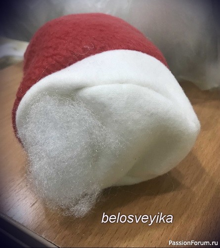 8) Хоть под бородой не будет видно,но я все равно сделала имитацию воротника шубы.Для этого выкраиваю полоску из белого флиса по перечной нити шир. 5 см, и прострачиваю ее со сгибом по длинной стороне.Затем выворачиваю и получаю белую длииную круглую полоску. Можно пришить либо приклеить на шею.