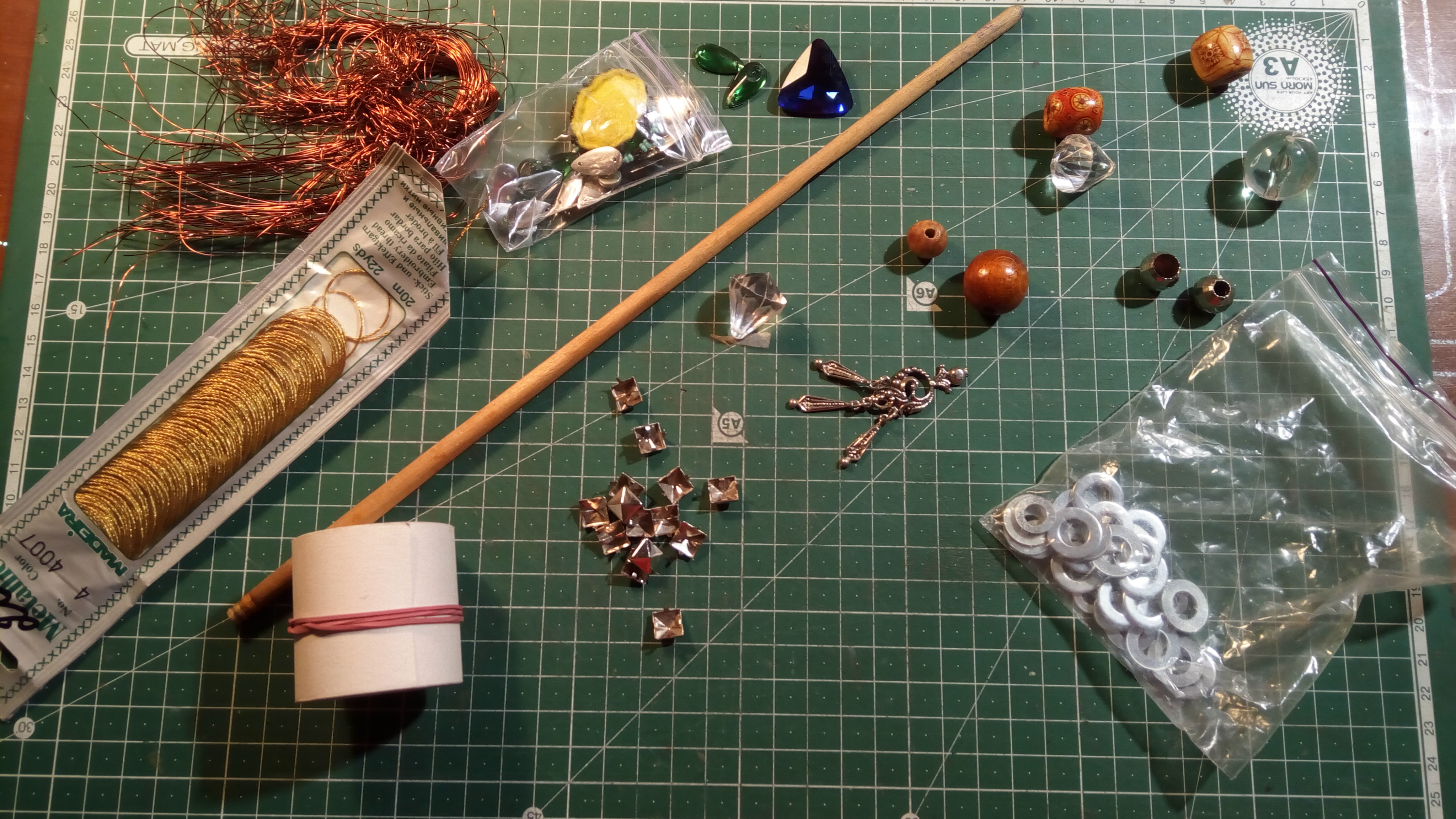 Не поверите, но я была очень рада, когда этот набор сложился:) Верхушка - это то, над чем я реально ломала голову: "из чего? как? нам же скипетр нужен, а не волшебная палочка!". И в какой-то момент Муза сжалилась, практически одномоментно высыпав мне на глаза конусную подвеску (в прошлом- часть "музыки ветра"), граненую бусину с широким отверстием и модную некогда серьгу. Вот серьга и положила конец моим терзаниям: вот он - ГЕРБ! ГЕРБИЩЕ!!!!