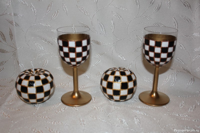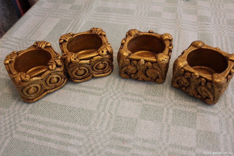 Обычные икеевские стеклянные подсвечники превратились в бронзовые с помощью глины, зототой краски и битума.