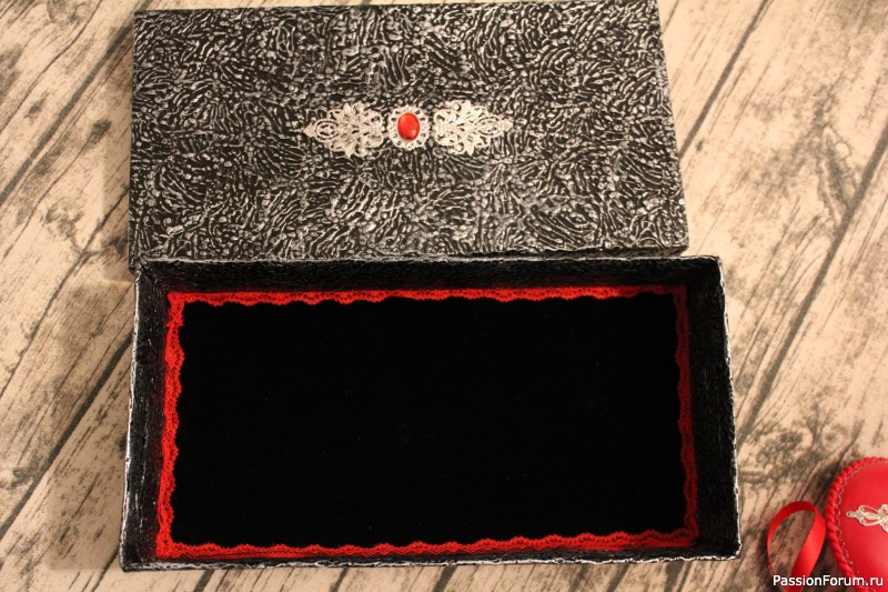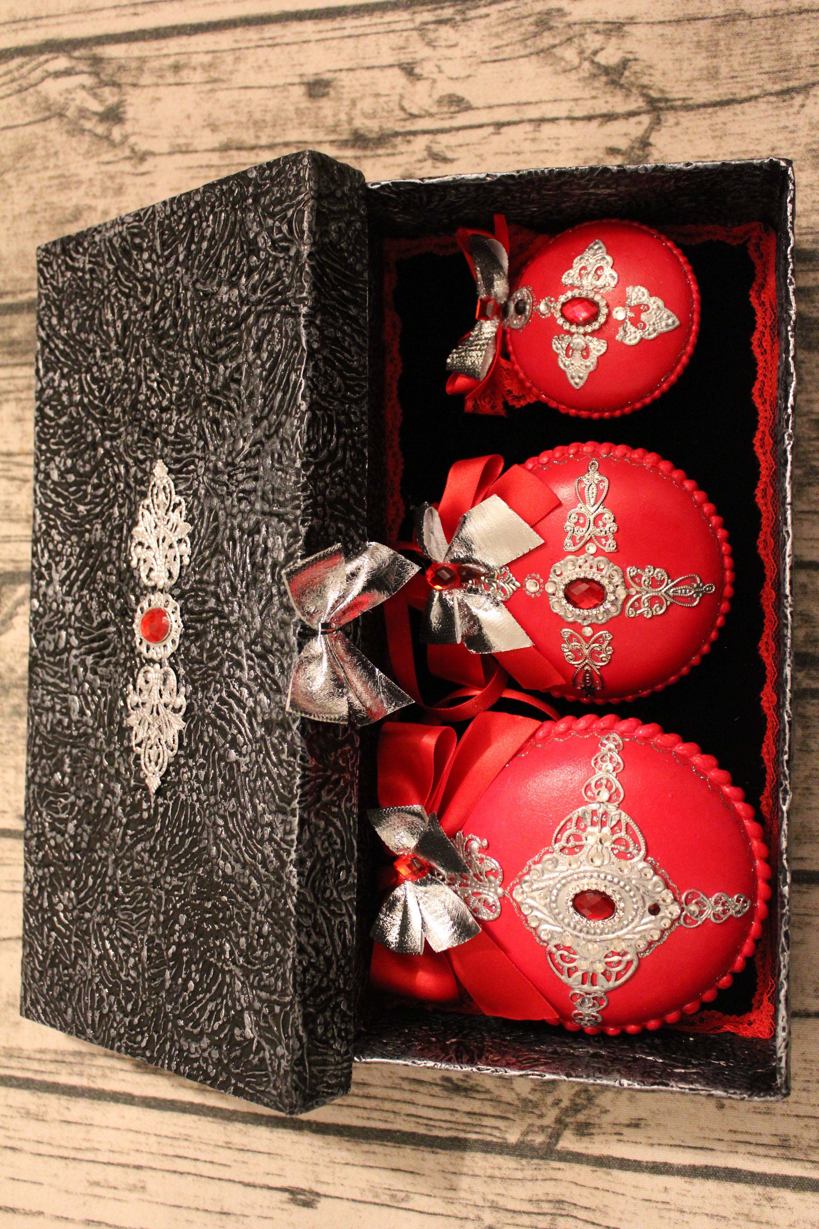 Елочные игрушки сделаны из пластиковых заготовок. Коробки к ним делала сама из картона, сверху обклеила обоями с выпуклым рисунком, внутри черный бархат и коричневый фоамиран.