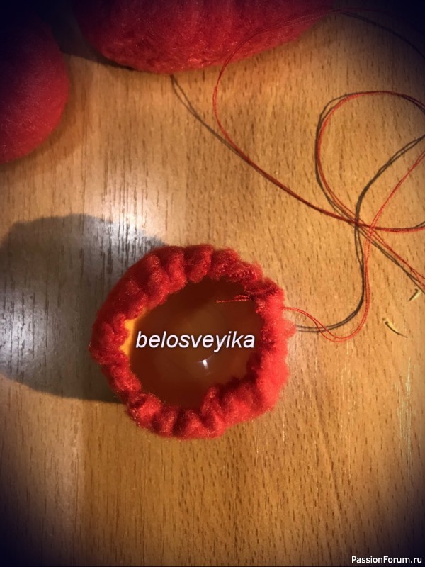 16) чашечки полусферы обшиваем красным флисом. Для этого вырезаем круг и собираем его на нитку