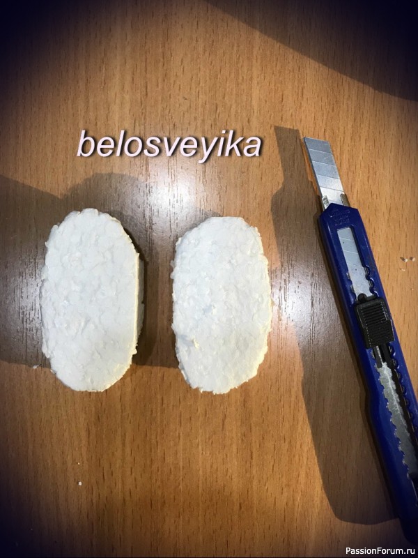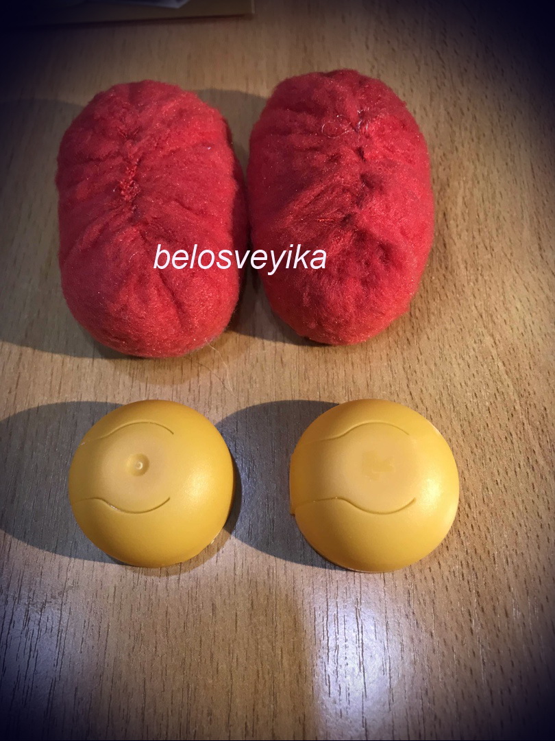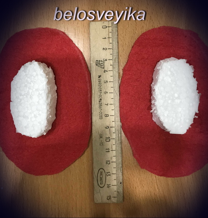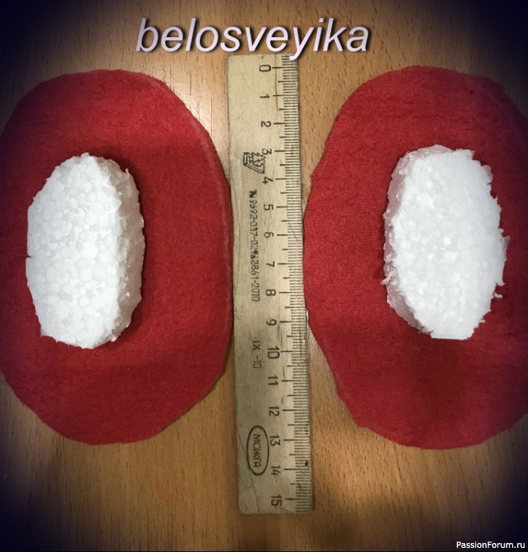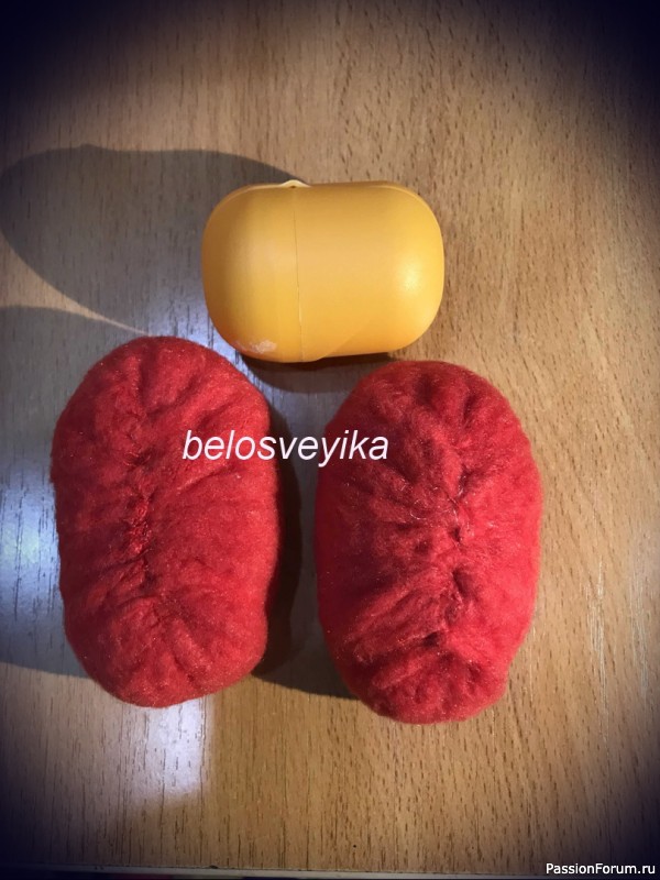 У нас 2 шт обуви, 2 обшитых полусферы и вырезаем 2 овала их флиса