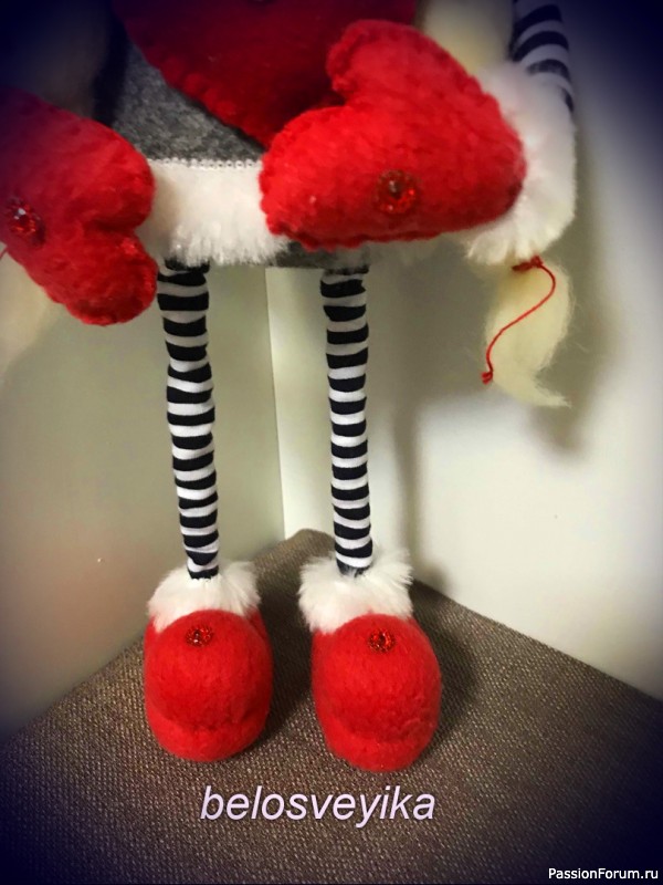 Украшаем обувь,варежки,шапочку, приклеиваем сердечко на шубку посередине.