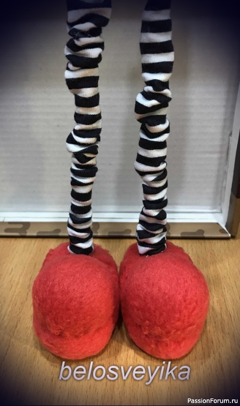 19) Проделываем отверстие и вставляем палочки/ноги Потом вынимаем, вставляем носик горячего пистолета,выдавливаем клей и тут же вставляем палочку,зубочисткой прикладываем край полосатой штанины к отверстию,там клей выступает и все приклеивается.