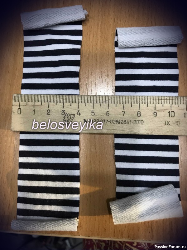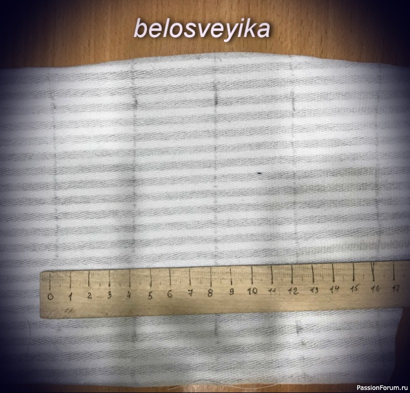 6) Размечаем по 4 см полосы,ткань распоогаем так ,чтоб рисунок полос был поперек ног
