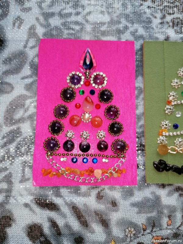 Как я делала ёлочки: На деревянный задник от рамки на прозрачный двусторонний скотч приклеила ткань, лишнюю ткань обрезала. И стала клеить на ткань с помощью клея момент прозрачный всякие детальки, формируя ёлочку: кобашоны, приплюснутые металлические шапочки для бусин, стразы, цепочки, мелкие камушки.
