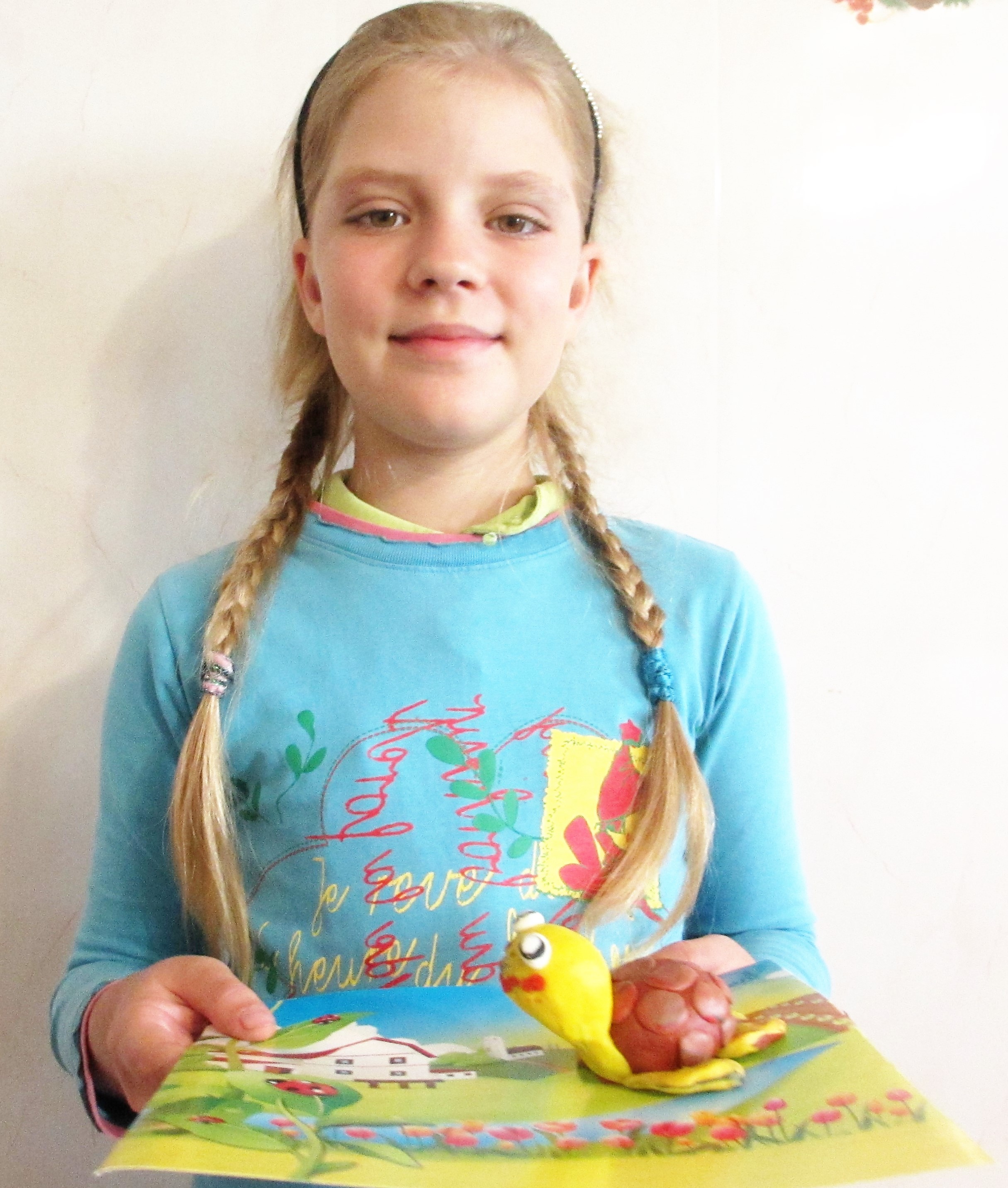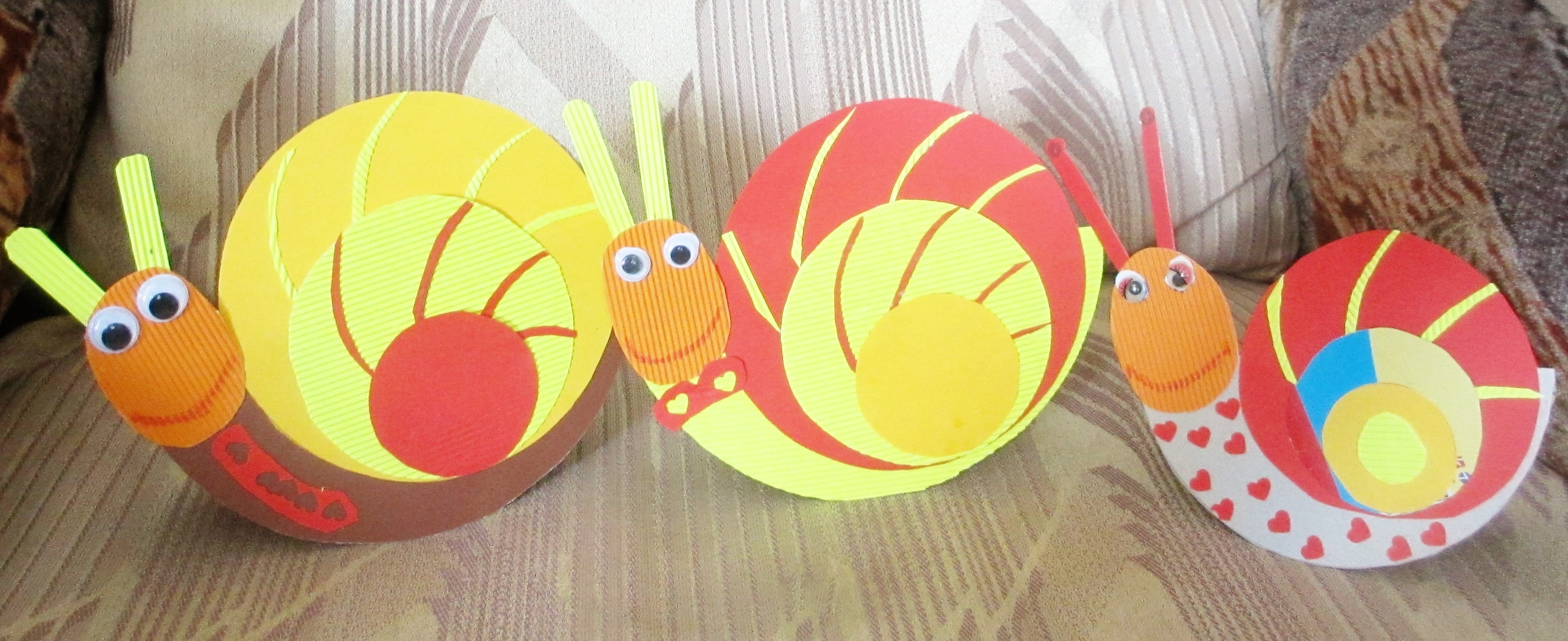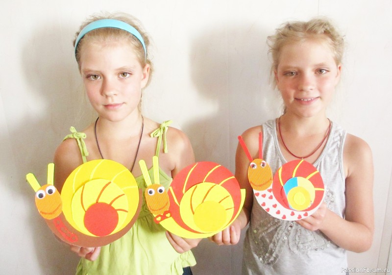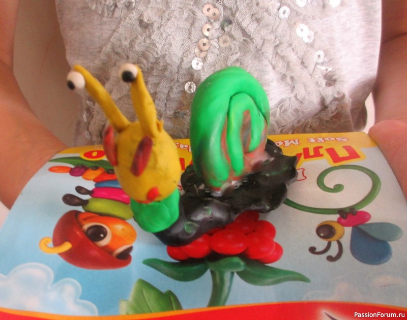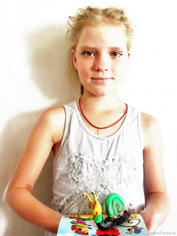 Алиса: "А я слепила улиточку - радужную, использовала все остатки пластилина. Моделью служили наши питомцы - ули."