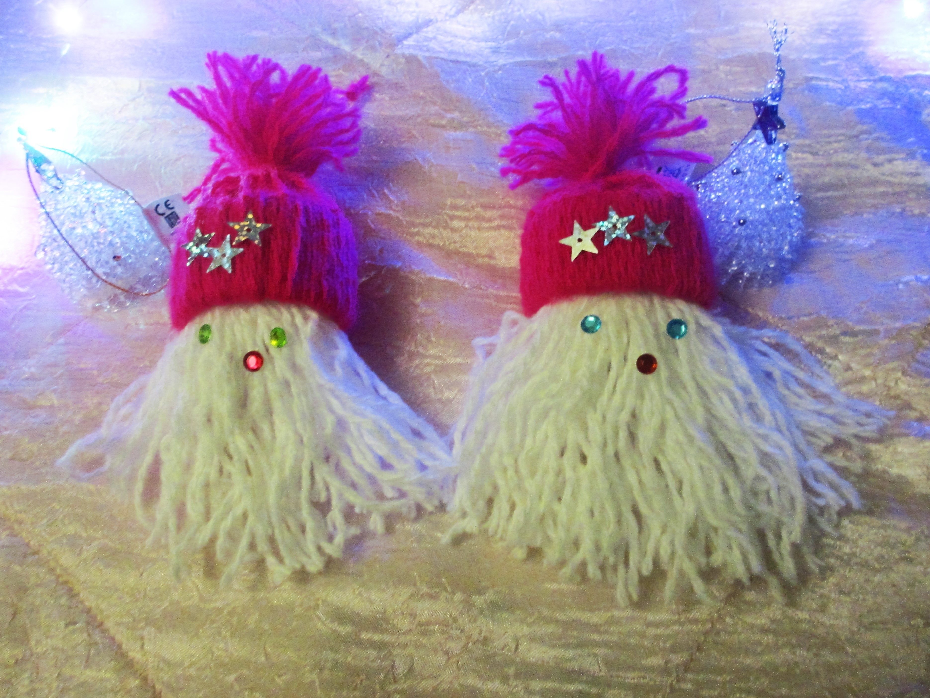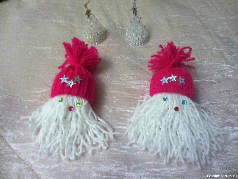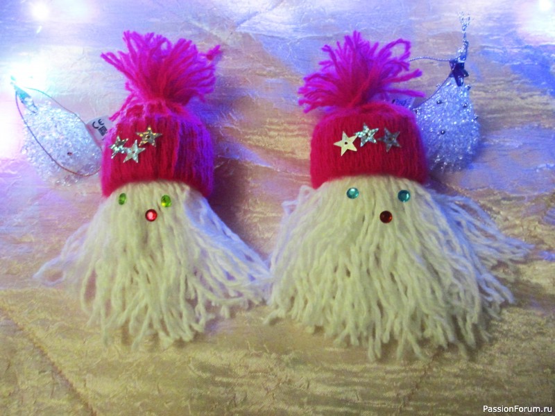 Алина: "Бороду сделать ещё легче: намотать на ладонь(4 пальца) белую нить, пышность бороды зависит от количества витков; между витков связать(как помпон), с другого конца разрезать, распушить, если нужно - подрезать. Приклеить связанный конец внутрь шапочки, украсить лицо- глазки, носик, шапочку. Дед Мороз готов!"