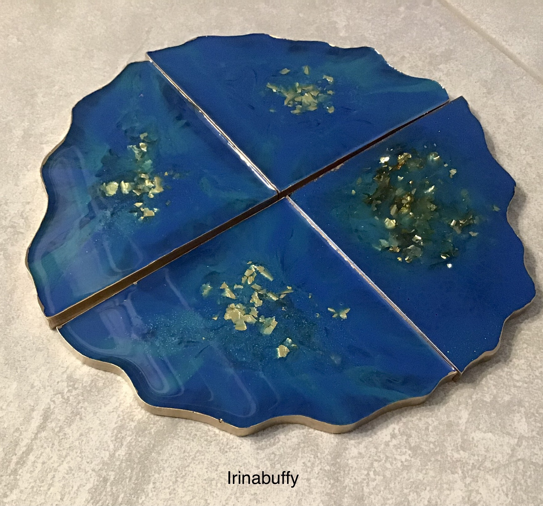 Всем привет!Продолжаю осваивать эпоксидный смолу.На этот раз все получилось хорошо.Я имею ввиду чисто технически,Хорошая толщина,твердость,без наростов и недоливов.Порадовала и обратная сторона,рисунок сохранился,хотя и есть недочеты.Попробовала вставить ручки в подносик,понравилась идея,сверлить я точно не хочу.Над рисунком буду работать.Использовала два пигмента:синий и бирюзовый,листовую поталь и жидкую ,блестки.Поднос заливала за два раза,первый-цветной,второй - прозрачный.Это для большей высоты и твердости.Первые подставочки для бутылок немного прогибались,поэтому учла предыдущие опыты,и заливала молды под завязку.Рада всем заглянувшим.Всем здоровья и благополучия!