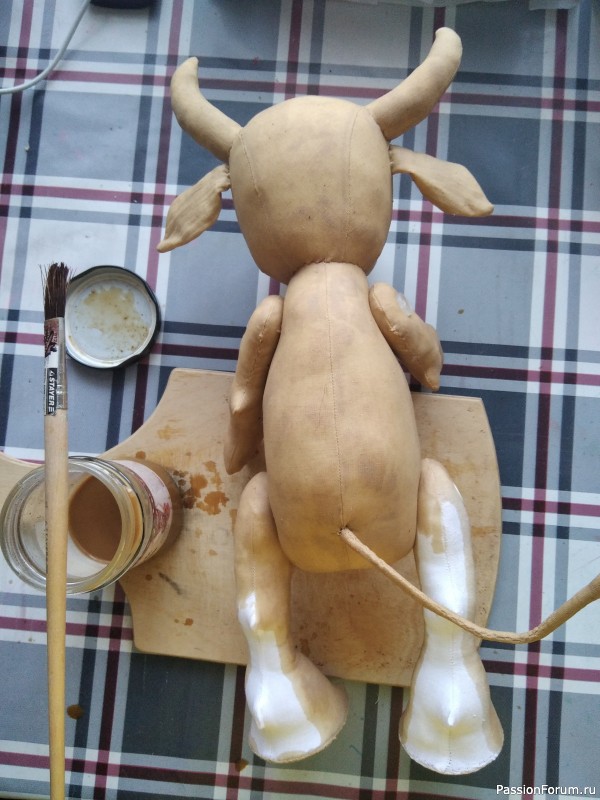На стопы ножек пришиваем картон обтянутый тканью для устойчивого положения бычка.