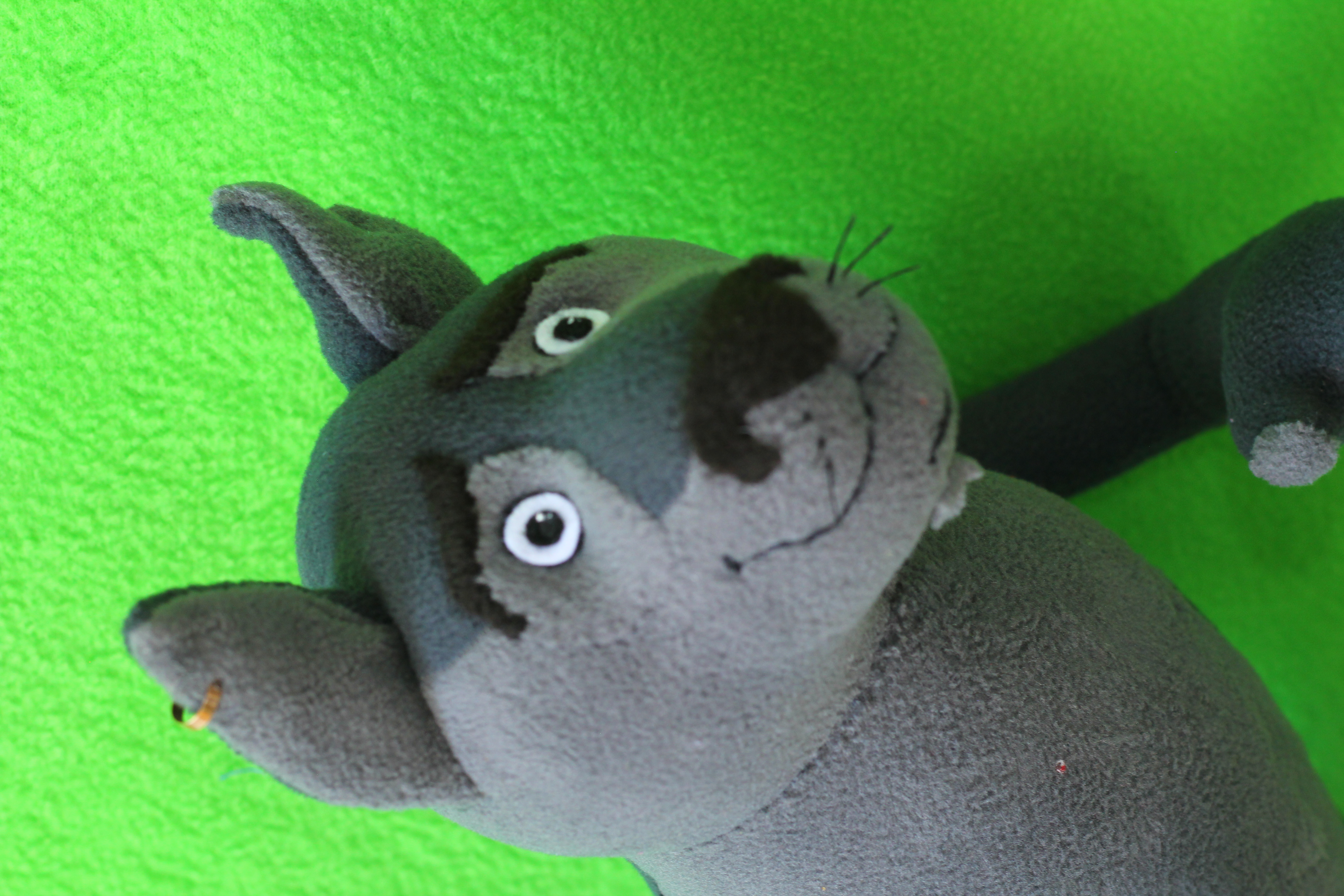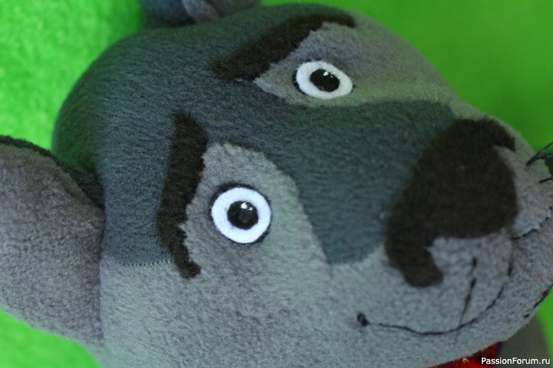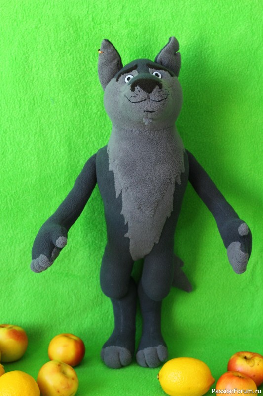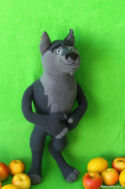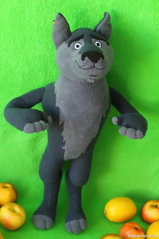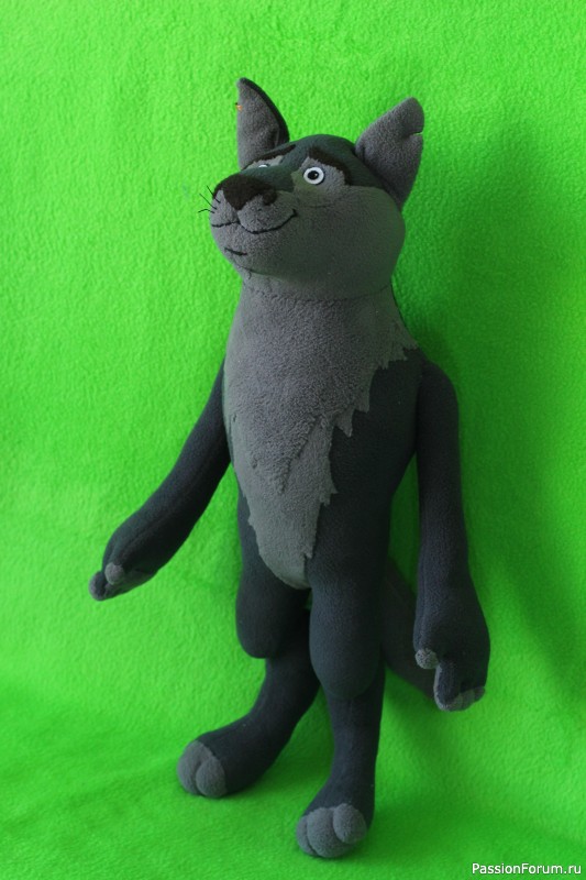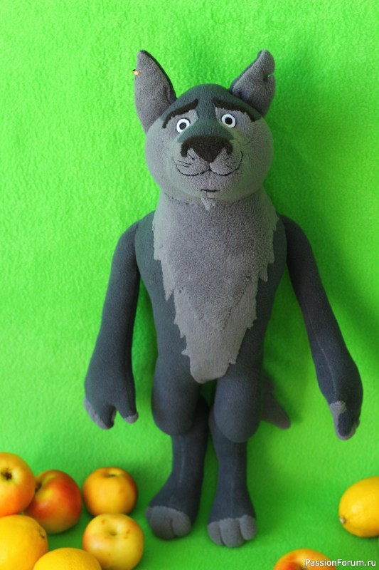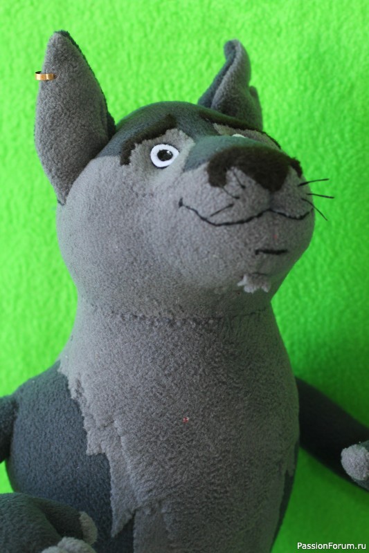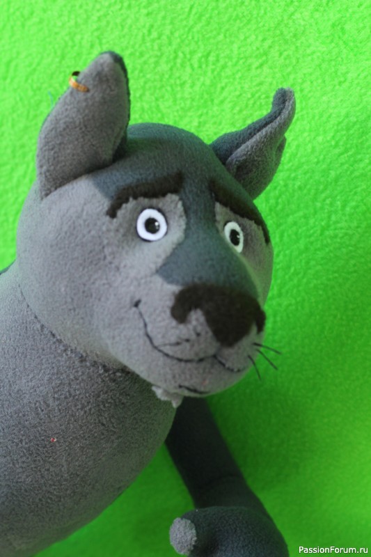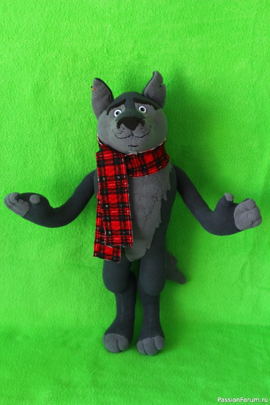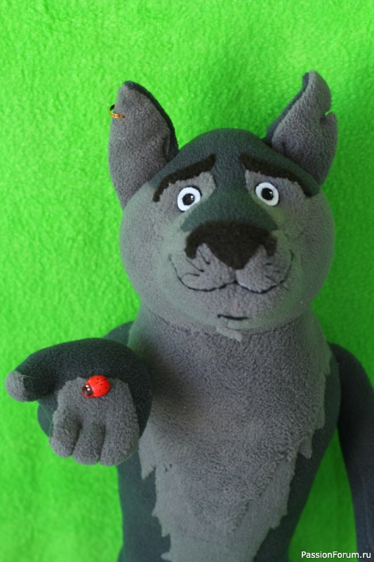Тамара, как хорошо, что Вы его узнали! Это именно этот Волк) Из этого мультика)). Выкроек в интернете нет вообще волка, то что есть, скорее пёс). Пришлось потрудиться)). Но у него гнуться лапы, можно интересно играть). И он такой приятный… Утяжку мордахи делала, иначе получился серый носатый мишка). Серьгу муж вытачивал латунную, усики -нитку проклеивала мулине… А так все детали на тушку нашивала вручную. Пальцы долго заживали