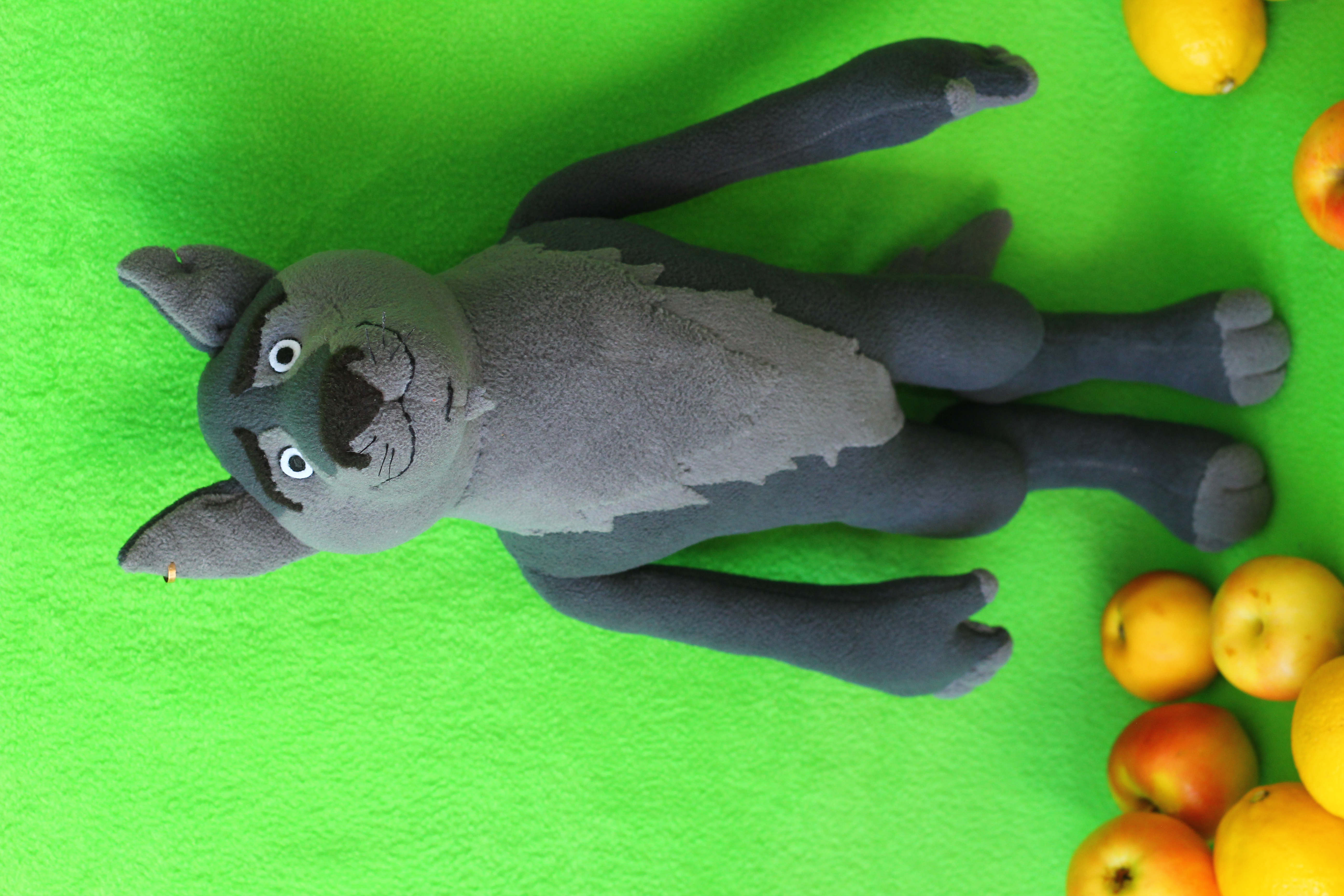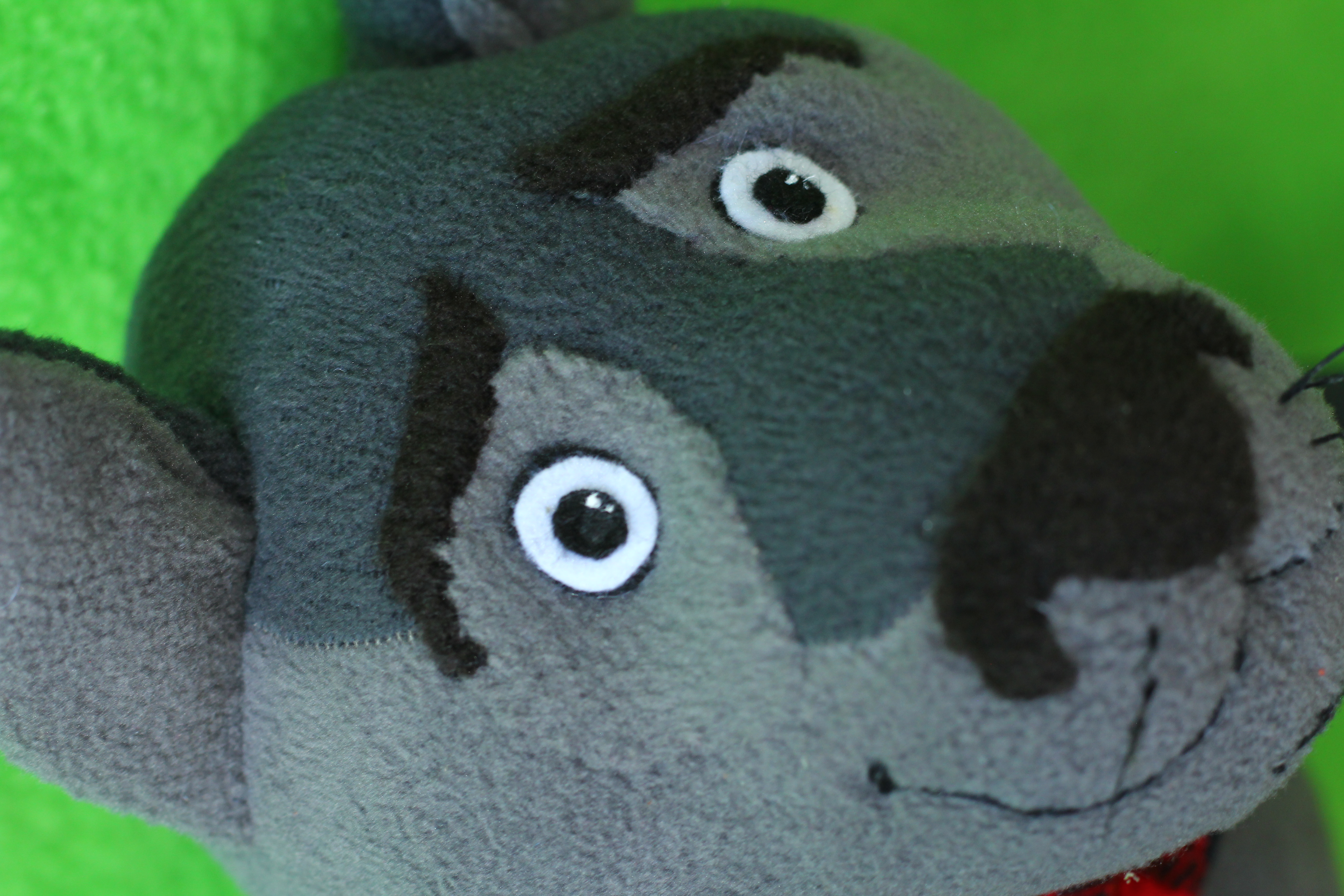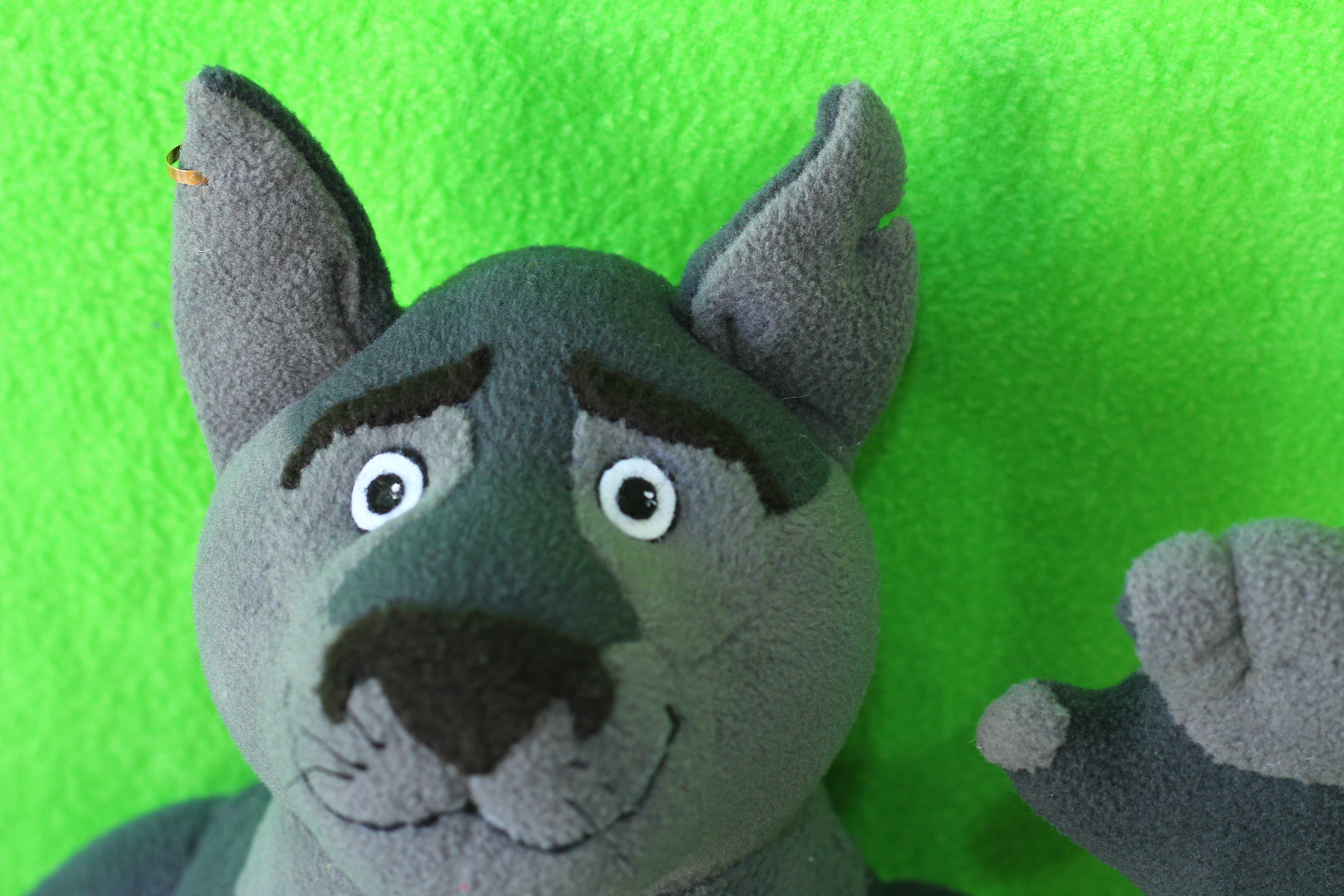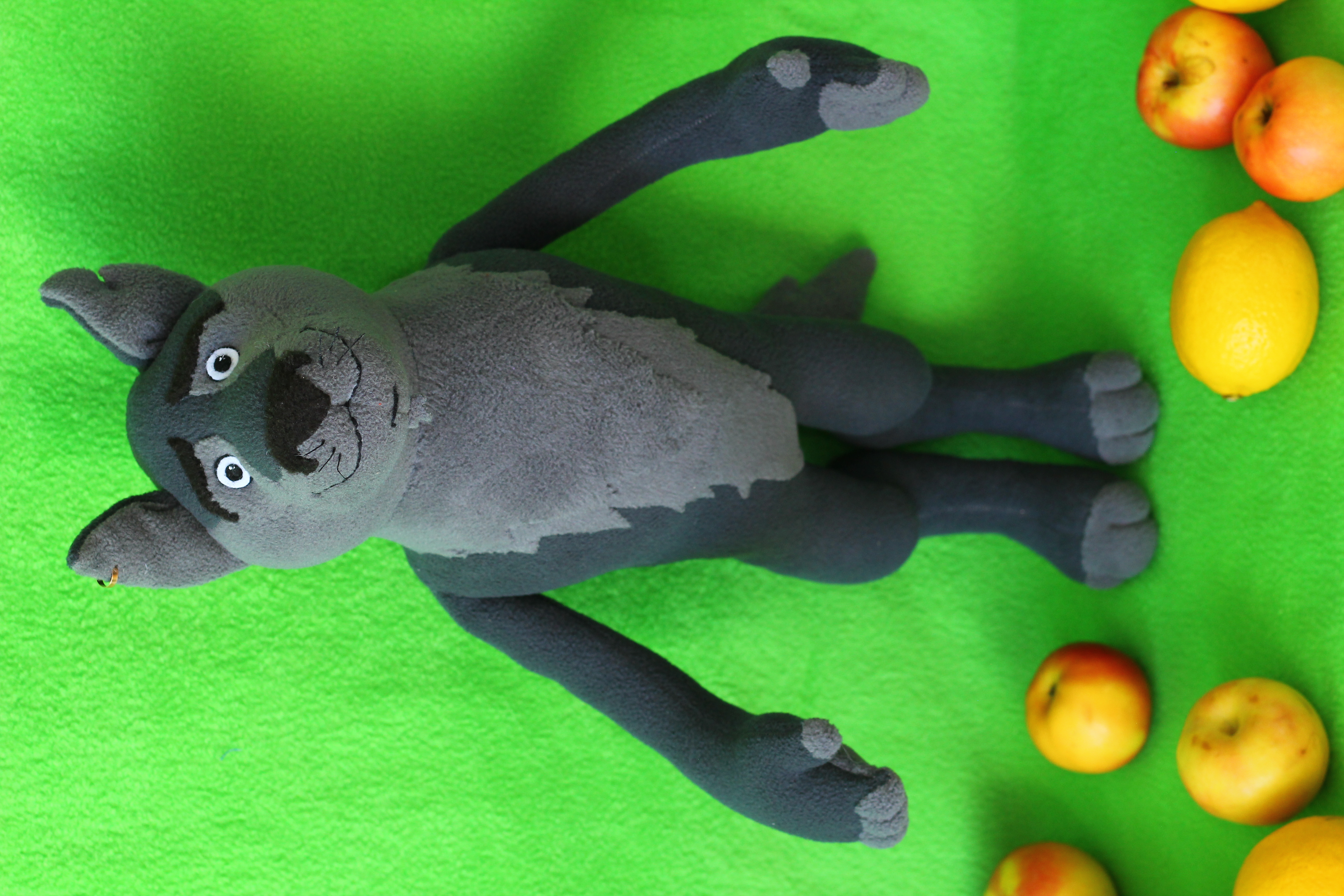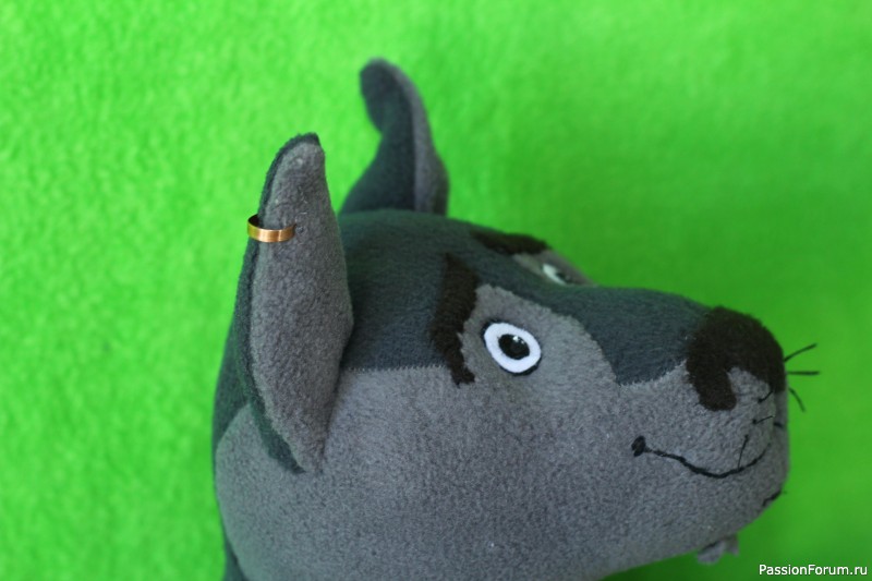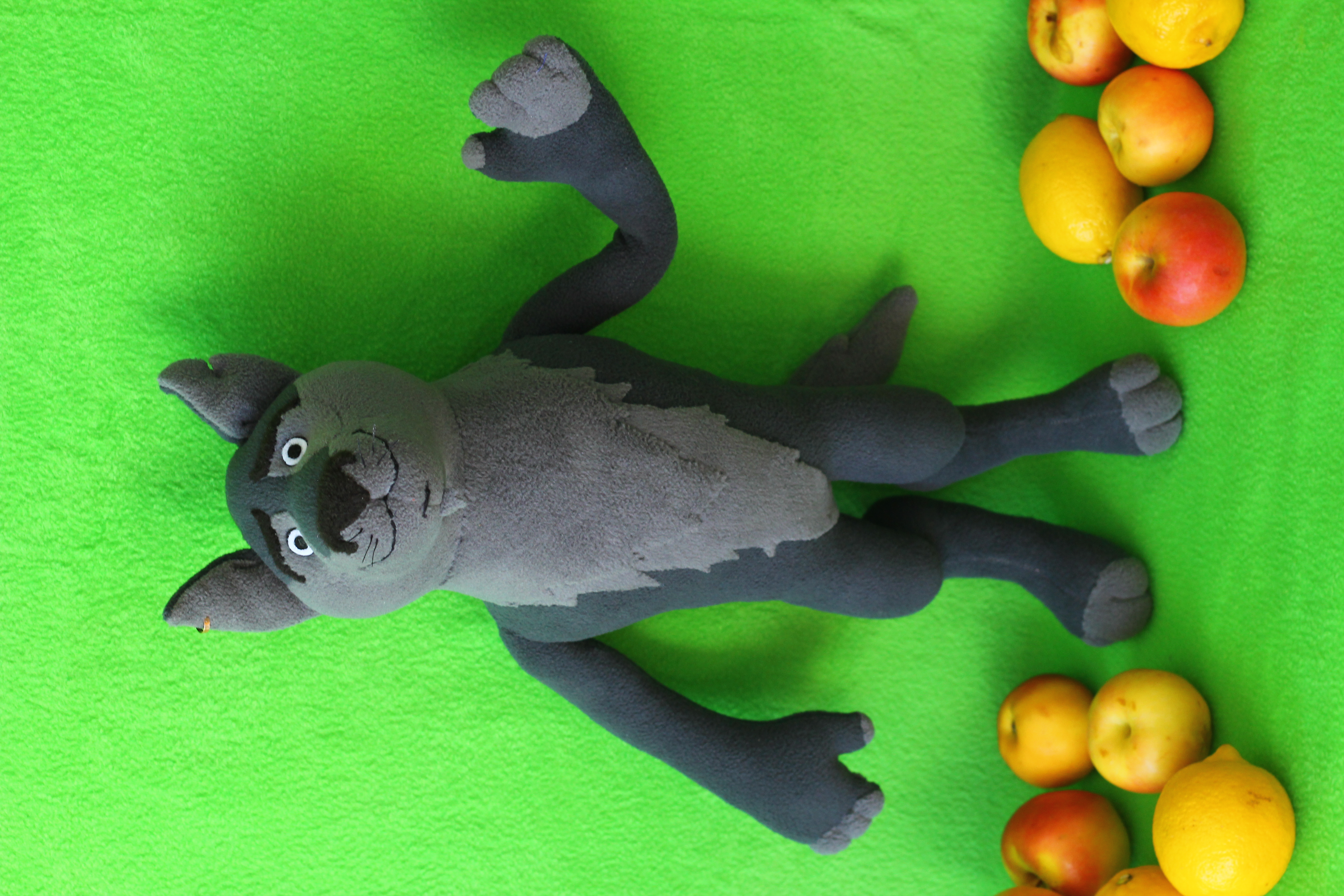Тамара, как хорошо, что Вы его узнали! Это именно этот Волк) Из этого мультика)). Выкроек в интернете нет вообще волка, то что есть, скорее пёс). Пришлось потрудиться)). Но у него гнуться лапы, можно интересно играть). И он такой приятный… Утяжку мордахи делала, иначе получился серый носатый мишка). Серьгу муж вытачивал латунную, усики -нитку проклеивала мулине… А так все детали на тушку нашивала вручную. Пальцы долго заживали