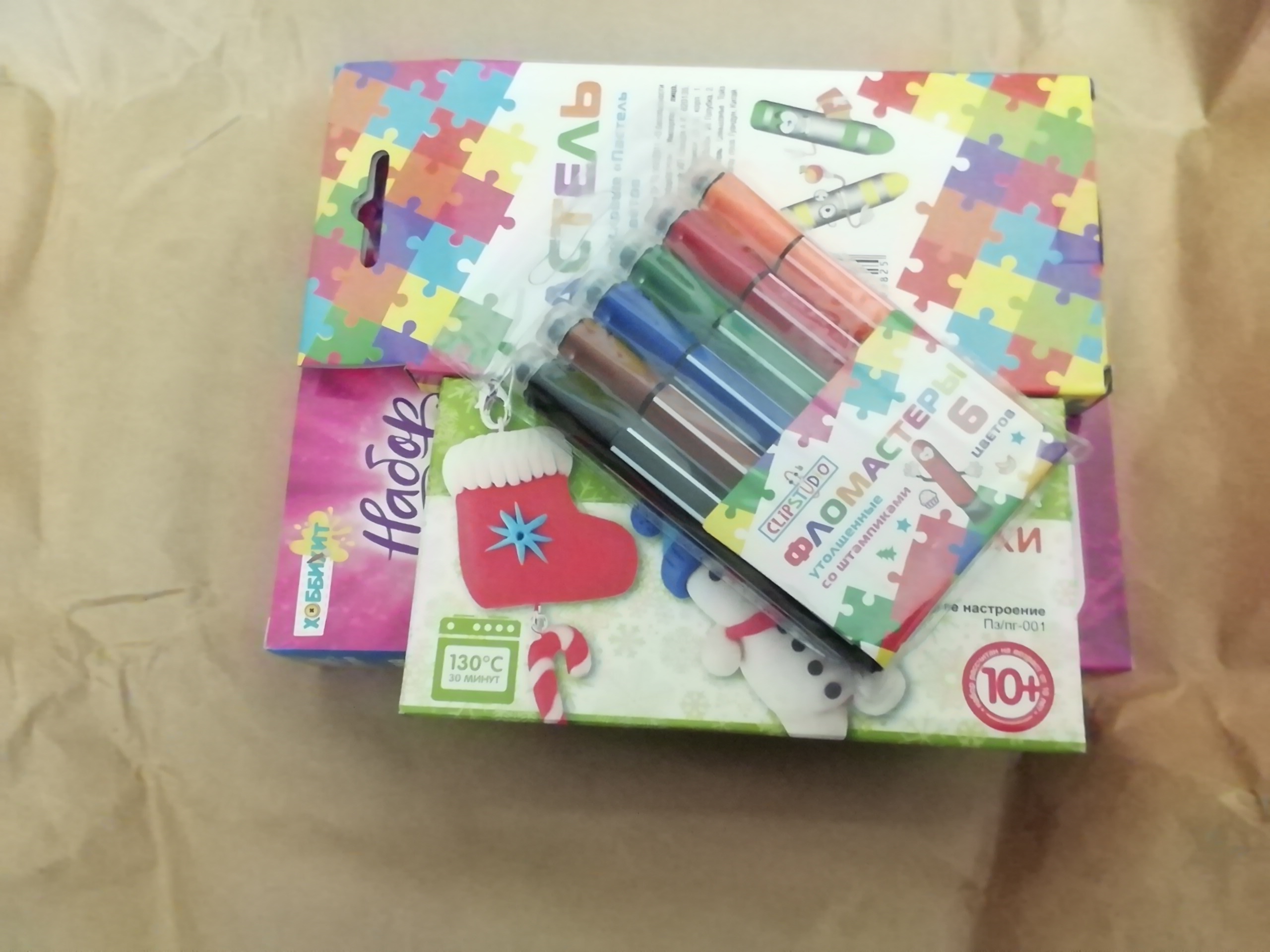 Развернули большой пакет, там оказались подарки для Насти. Всё просто замечательное, особенно масляная пастель для рисования. Она пока ждёт своего часа, а остальные наборы Настя в этот же день пустила в дело.