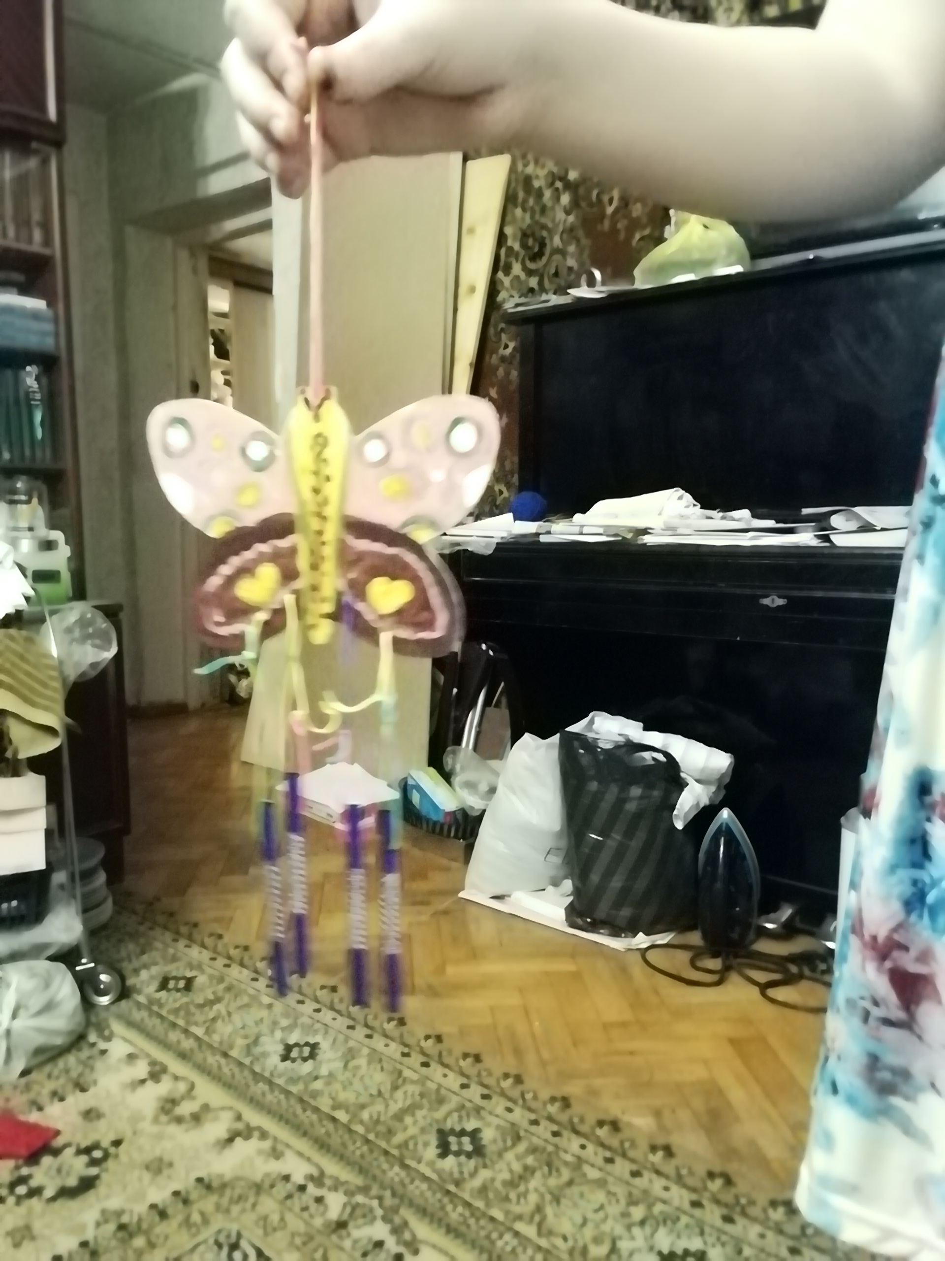 Получилась вот такая музыка ветра, висит сейчас в её комнате. (Приношу извинения за беспорядок на горизонте. Бесконечный ремонт. Уже от него устала.)