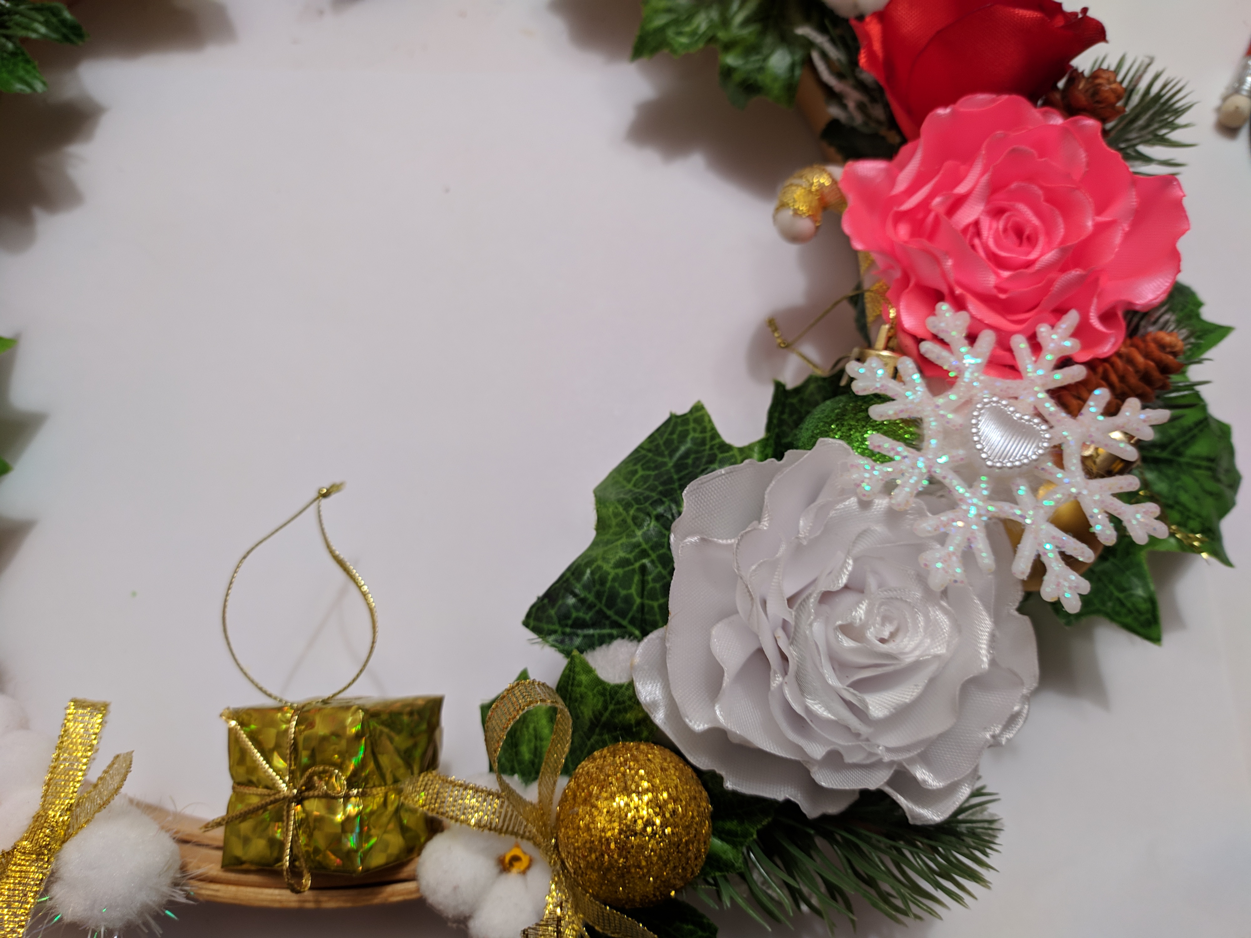 * декор левой части: 1-ый слой - листья и ветки, 2-ой слой - цветы и крупный новогодний декор, мелкий декор