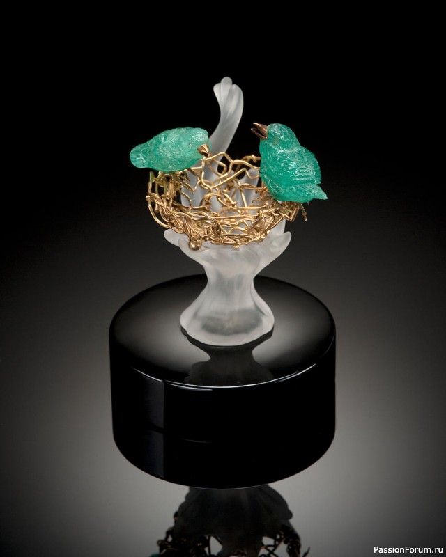 В этой резьбе, изображающей двух какаду, использован прекрасный ярко-розовый турмалин рубеллит. У каждого из них внушительные размеры, бриллиантовые глазки бриллиантовой огранки и полированный клюв из зеленого турмалина ювелирного качества. Ножки и гребни из 18-каратного желтого золота опираются на основу из натурального аметиста «роза». С золотой монограммой, подписью EB для банка Эберхарда на каждой птице.