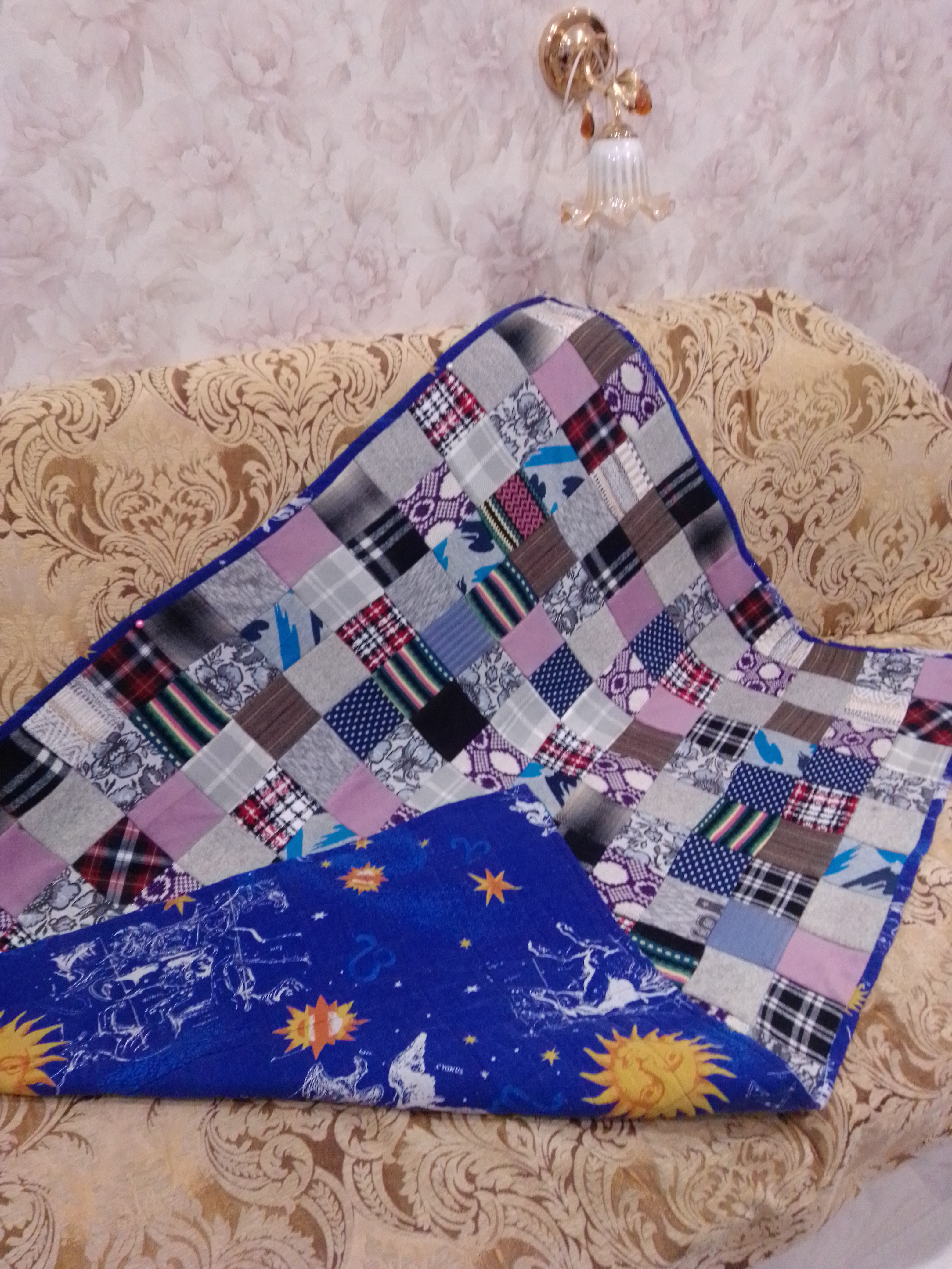 Приветствую всех рукодельниц и предлагаю вашему вниманию детский плед - подарок к новому году внучке. Размер 150 * 110 см. Дома у меня накопились разные вещи, которые уже не носятся, а ткань хорошая. И решила я сшить очередной плед. При подготовке к пошиву большого пледа и раскройке квадратов размером 19 * 19 см. у меня оставались небольшие обрезки, которые тоже было жалко выбросить. Из них я накроила квадратики 10 * 10 см. Получился детский пледик "Я его слепила из того что было". Вещи не сочетаемые по толщине и фактуре в пледе подружились. Квадратики к большому пледу ждут своей очереди. Пледик уедет в г. Копейск. Думаю, внучке понравится пледик в добавку к новогоднему подарку. Приятного просмотра.