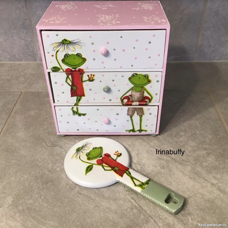 Комодик с лягушками — неожиданный по выбору самих персонажей. Легкий, радостный.
