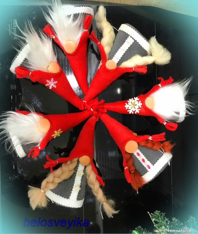 благодарю. Я считаю изготовление именно этих гномов самым простым из всех видов гномов. Ведь у них я не делаю конечностей. Они состоят из тела — конуса с дном, бороды или кос( в зависимости от пола) и шапочки, ну и носик конечно, шапочка и тело внутри набиты наполнителем. Я проводила с детьми МК по таким гномам, мы тело, дно и шапочку сшивали на руках через край ирисом. С такими гномами дети справляются очень легко.