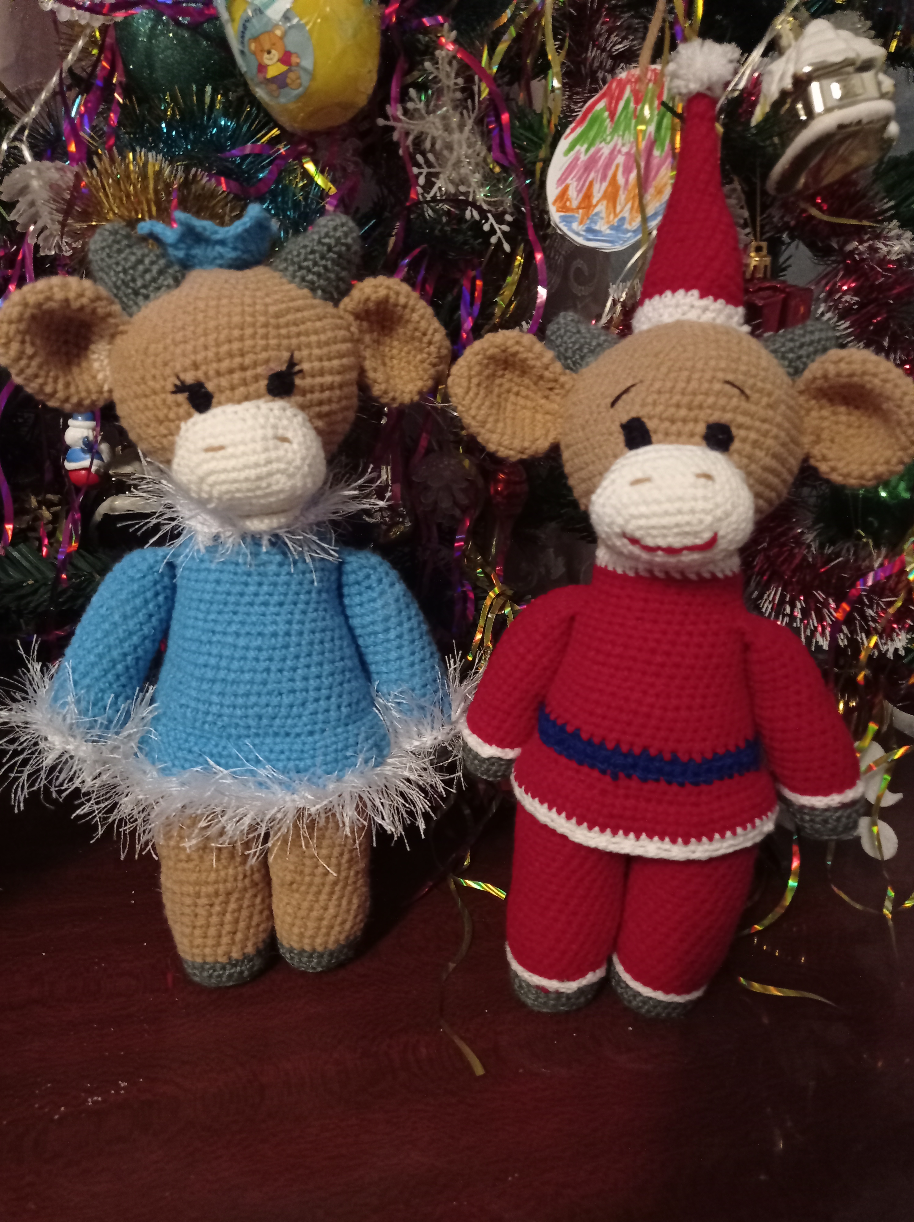 Бесплатный мастер-класс от Марины Величко по вязанию крючком бычка в костюме Деда Мороза и коровы в костюме Снегурочки. Для изготовления игрушек, символов 2021 года, автор использовала крючок 2.25 мм и акриловую пряжу Пехорка «Детская новинка». Голову бычку можно пришить либо сделать на шплинтовом креплении, тогда она будет вращаться.