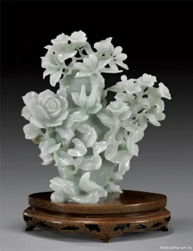 Великолепная резная нефритовая ваза с крышкой, 18 век. Ступенчатая крышка увенчана гроздью цветущих цветов лотоса.