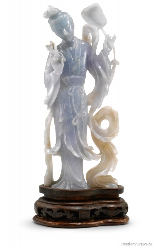 Резная фигурка Гуаньинь, коней 19 века. Нежно улыбающаяся Гуаньинь изображена в длинном халате и развевающемся шарфе, с бабочкой в правой руке и веером в левой, камень бледно-лилово-зеленого тона, деревянная подставка, инкрустированная серебряной проволокой