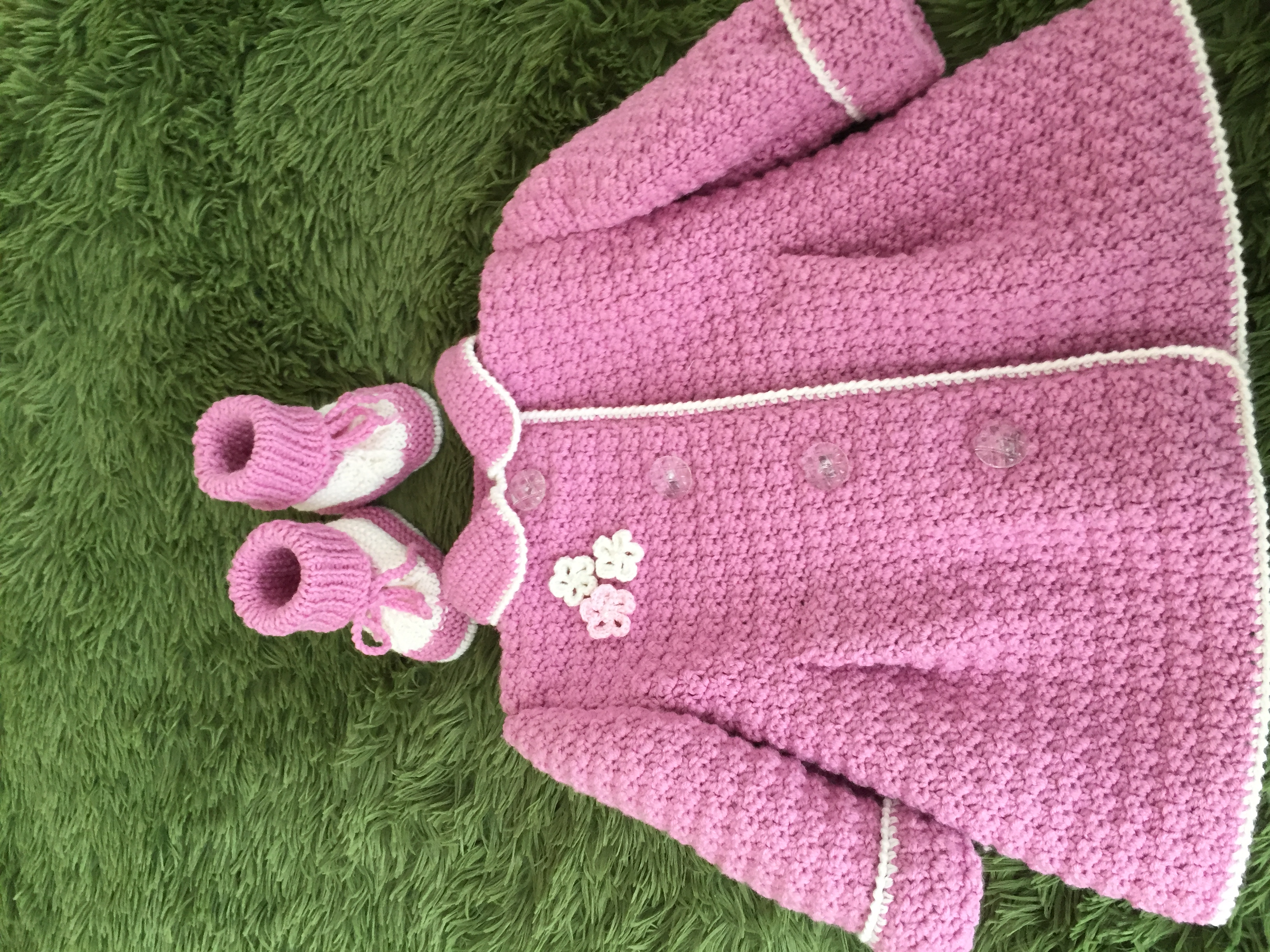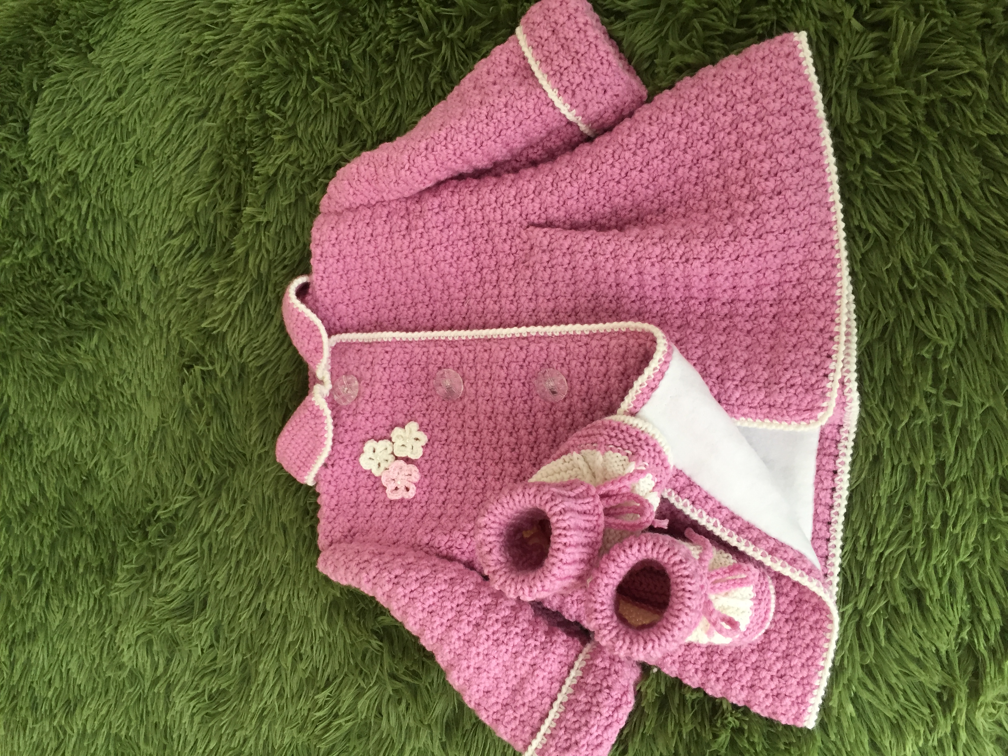 Всем здравствуйте, дорогие рукодельницы! Хочется показать вам свою работу и услышать ваше мнение. Пряжа Ализе Дана Голд 240/100, пальто вязала крючком Кловер 3,75, пинеточки спицами 3. Длина пальто от плеча 40 см., пинеточки по подошве длина 12 см.