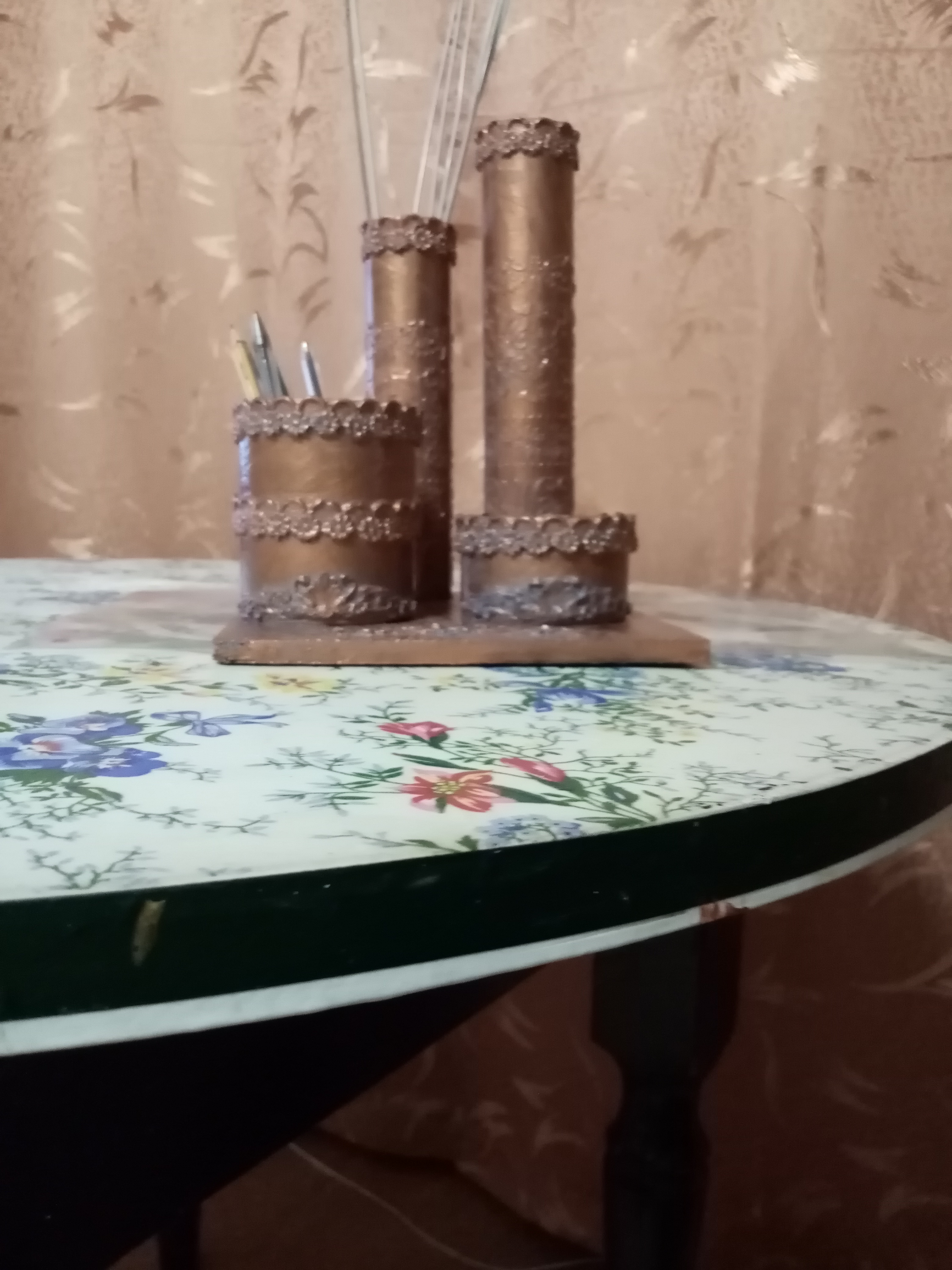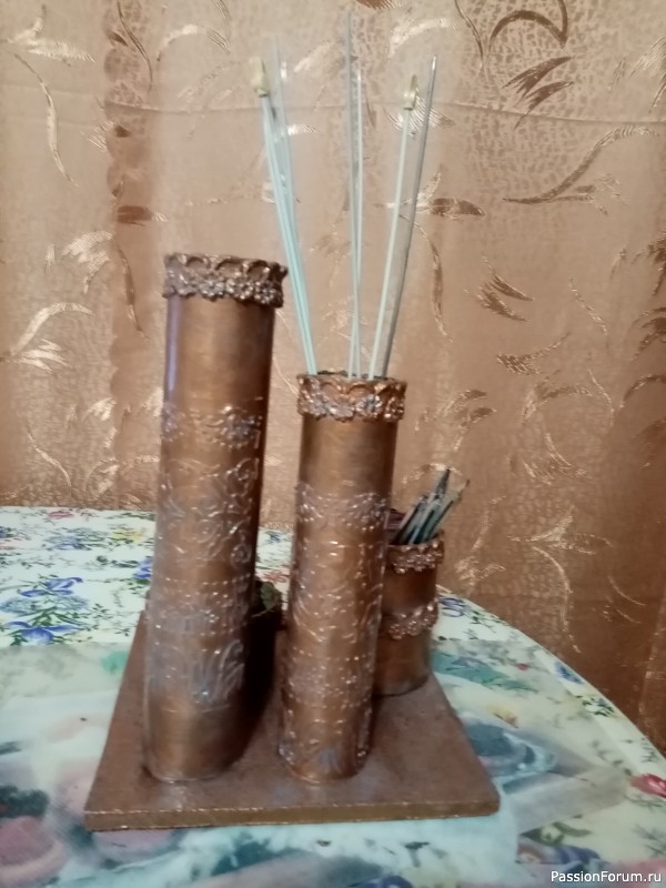 Ещё хочу поделиться с вами своими работами. Так долго не заходила, что даже не помню,, выставляла ли эти работы. В наборе пробовала глину das и краски металлик. А материал бросовый кружки от скотча и полотенец. На шкатулка пробовала сделать "резьбу по дереву", конечно, первый блин комом, да ещё и фотки плохие, переснять не могу. Ни того, ни другого нет.