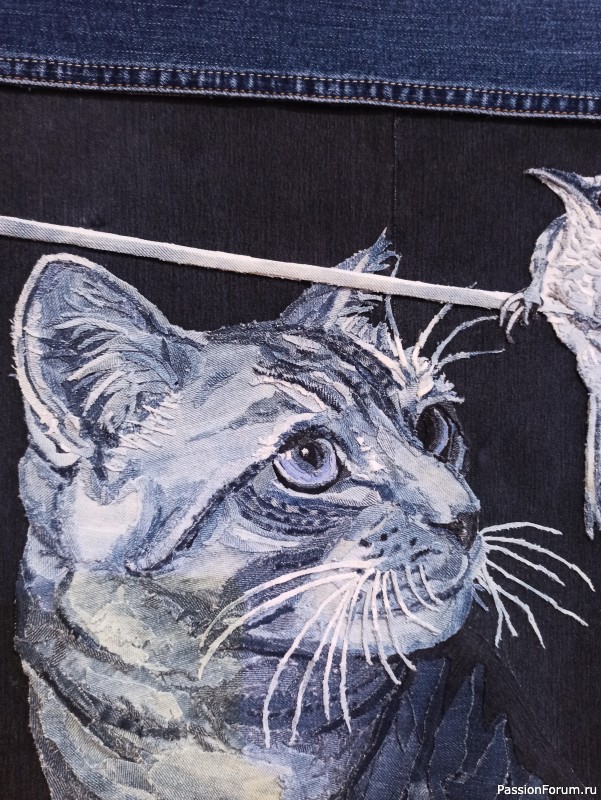Потрясающая работа! Татьяна, браво! Кошка как живая и птичка тоже. Они, что, из кусочков джинсы собраны? Изумительно.
