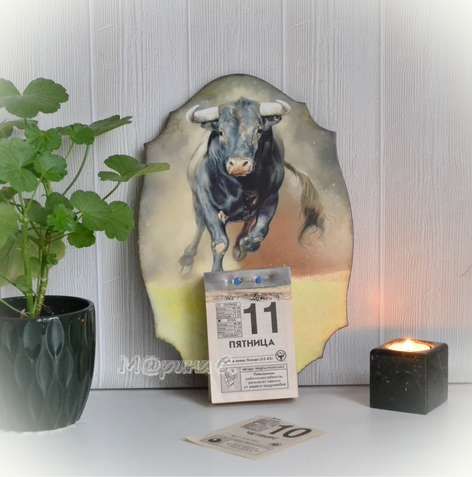 Марина!!! Я уже вам писала, что ваши подвесы полный восторг!!! Мастерски все исполнено-подрисовка картинок классная!!! Сейчас такое разнообразие этих отрывных календарей по тематике.Иногда покупаю -Полезные советы и Календарь садовода.Наверное тоже надо сделать подвес на дачу в садовым мотивом.У вас основа-заготовка фигурно-красивая.На первом фото на картинке, красавчик-бычок очень мне знакомый.
