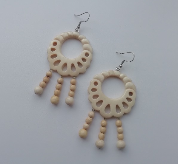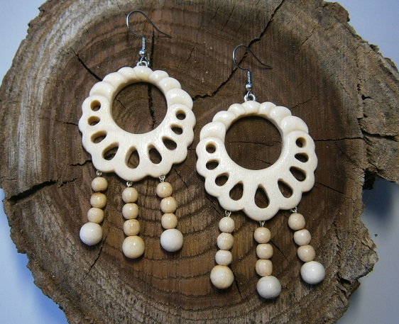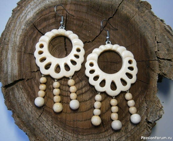 Пожалуй, начну с серёжек.Основную часть вытачивала из берёзы, бусинки большие из берёзы, маленькие из бамбука. Гадала, что лучше сделать: серёжки или подвески к очелью. Всё же решила серёжки.Ну вот такие они вышли.Лёгкие-лёгкие.