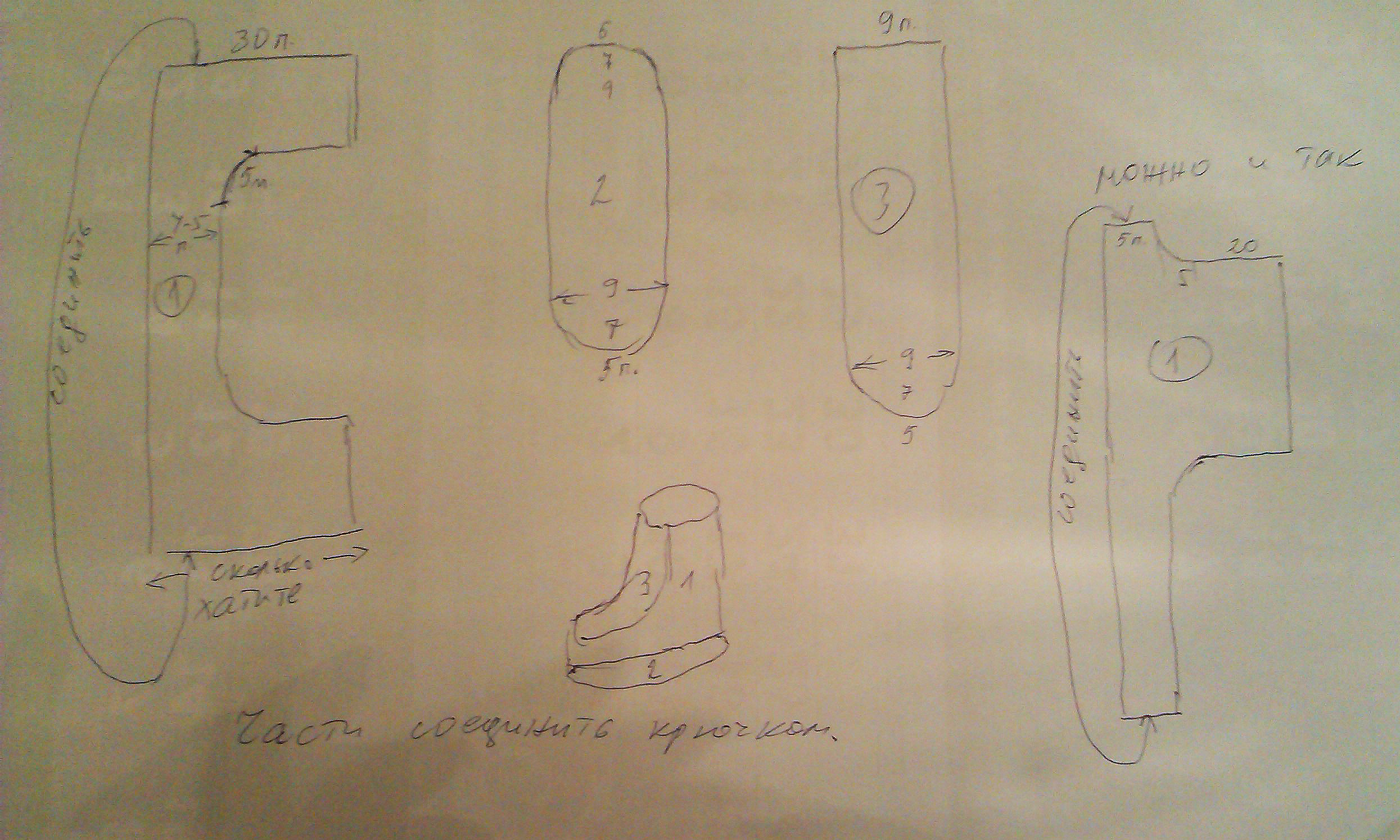 Поскольку мне немного сложно объяснить по-русски, я показываю вам схему, не очень хорошую, как я их связала. Я использую толстую пряжу и вяжу по №6. В зависимости от размера стопы судите о размере. Учтите, они растягиваются, поэтому будьте осторожны. Приятное вязание.