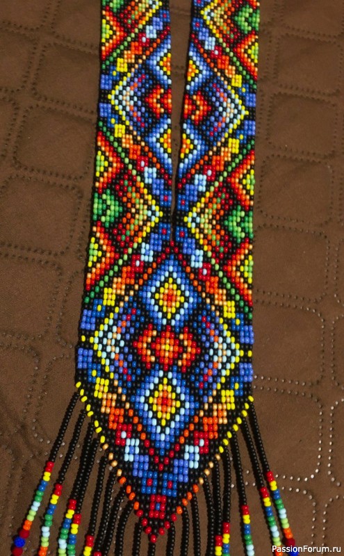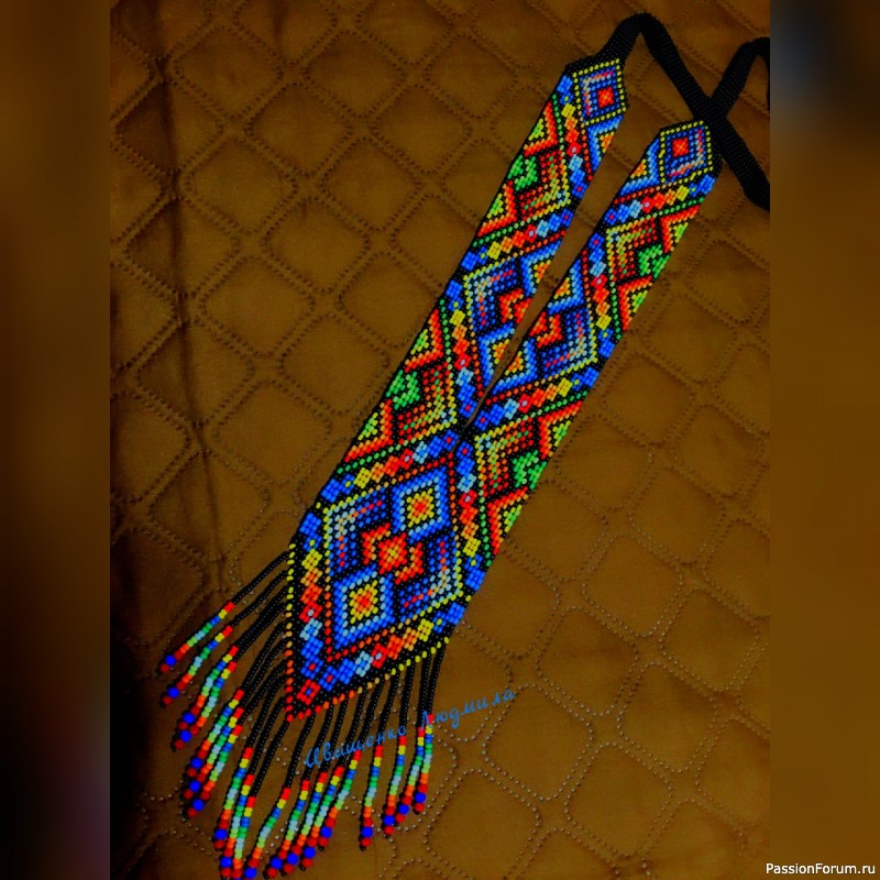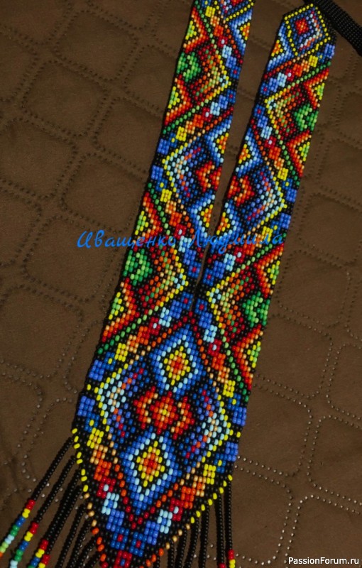 Этно- украшение изготовлено из чешского среднего бисера(8) на станочке для ткачества бисером.Прекрасно украсит любой наряд.Длина 60см,ширина 8см.