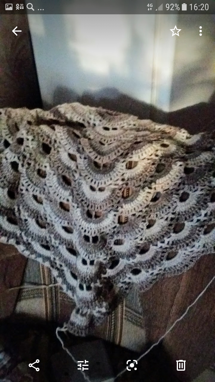 Очень красиво! А спицами там потом надо ВТО делать и во время ВТО надо булавочками закалывать, фиксировать шали. Тогда будет ровно и красиво и пряжа будет раскрываться.
