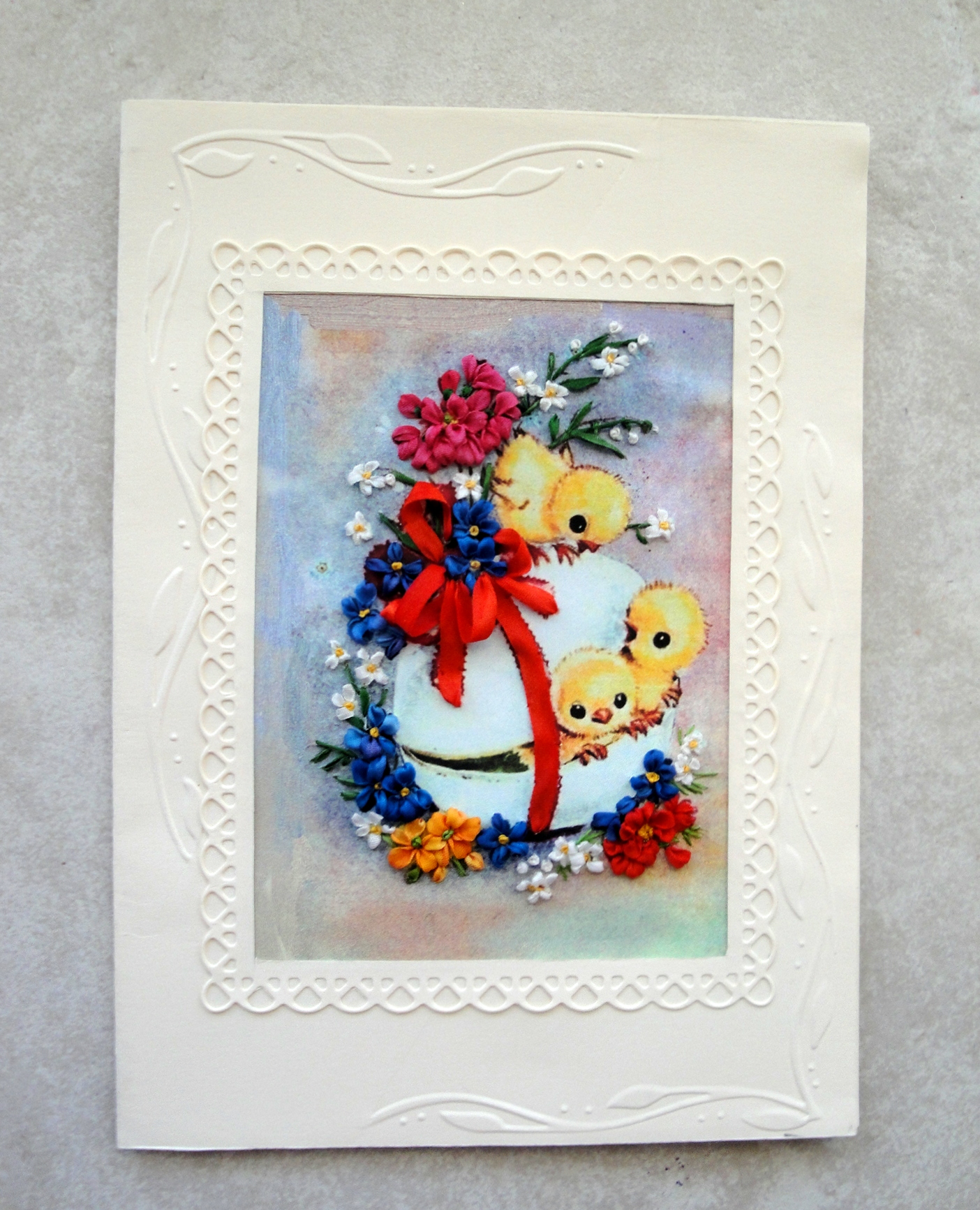 Всем доброго дня и хорошего настроения!Попросили вышить открытки к Пасхе, начала с простенького.Размер вышивки 8.5 х12 вышито лентами 2 мм из натурального шелка ,покрашенными вручную