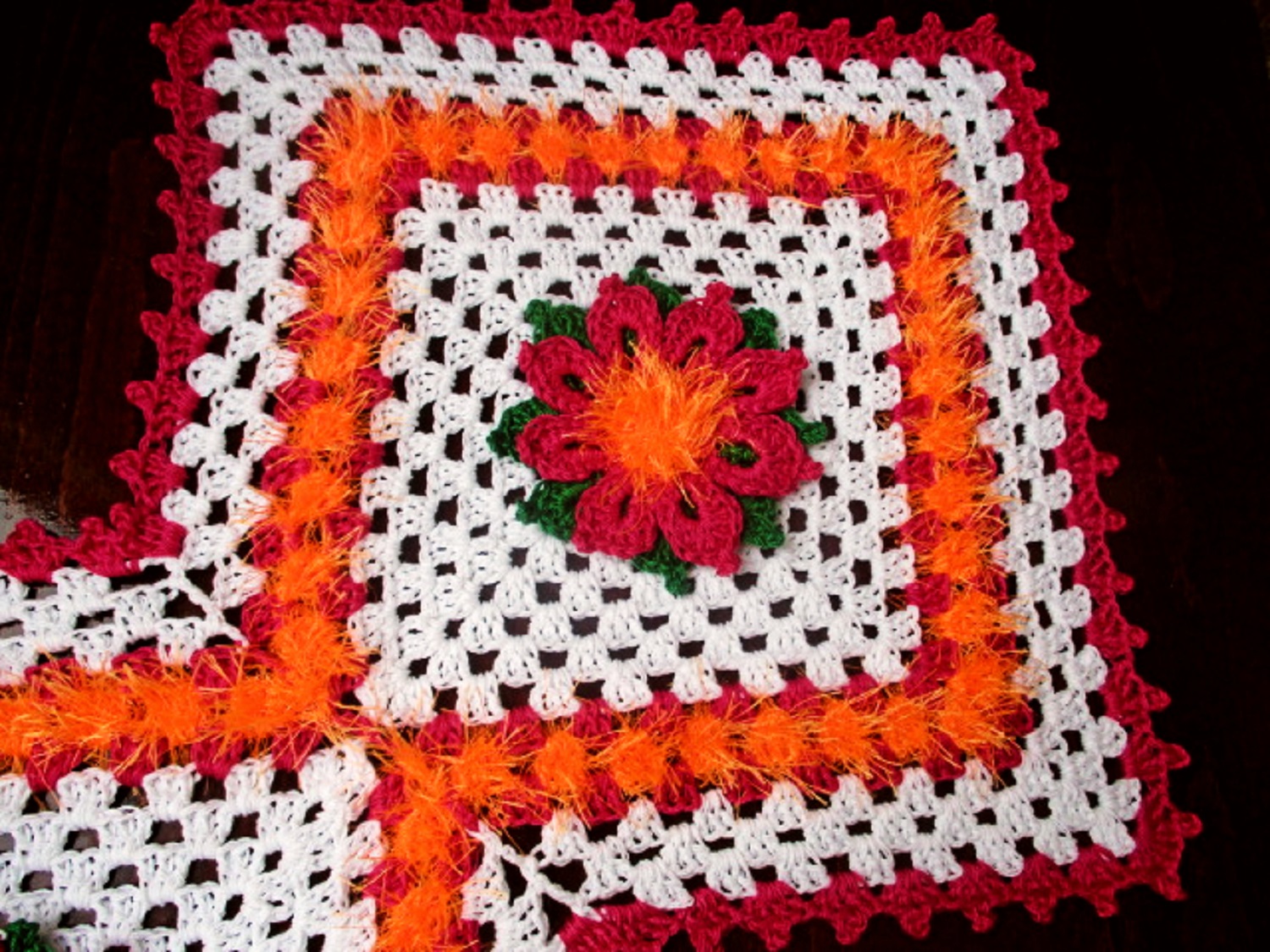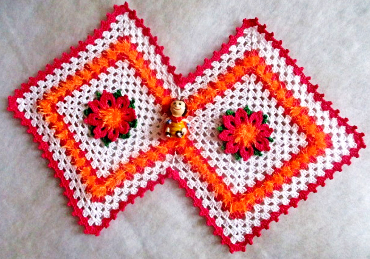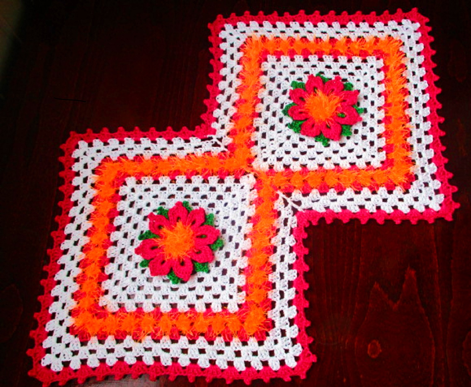 Вязала по ролику в Ютубе, пряжа х\б + травка, 70см длина, 40 см ширина. В оригинале связаны три квадрата, я вязать третий не стала, два для меня в длину достаточно