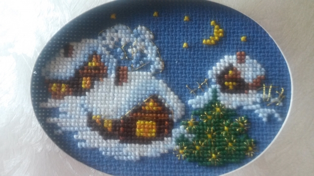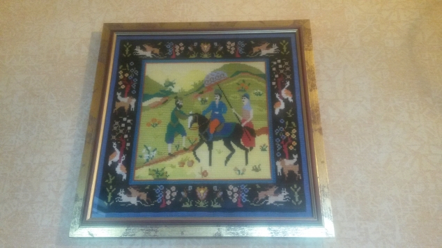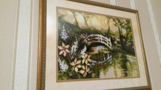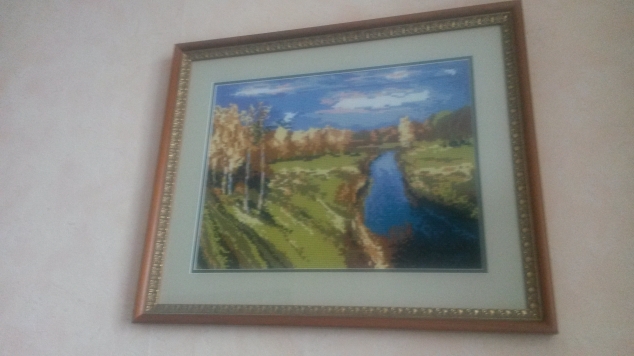 А эту прелесть мне подарили. Ну как подарили, приехала подруга, она вышла замуж - уехала жить в Америку. Прислала своей младшей сестре эту вышивку - страмин с рисунком, нитки надо подбирать. Та вышила квадрат 10 на 10 крестиков и забросила - отдали мне. Вышила, хотя тема мне не близка, хотела возвратить - не взяли. Вот теперь висит в коридоре - оформленная...
