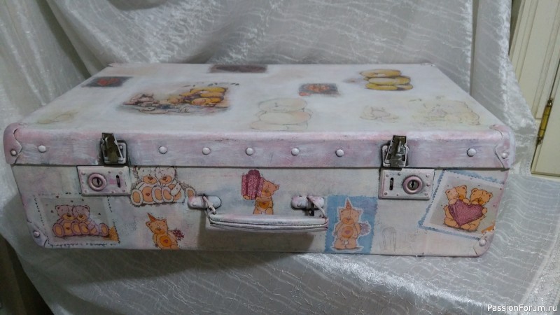 Галина-очень интересное преображение старого чемоданчика!!! И тем более приятно, то ты подарила ему дальнейшую вторую жизнь для служения игрушкам!!! Милые мотивчики с мишками!!! Удачно пристроила второй салфеточный слой.