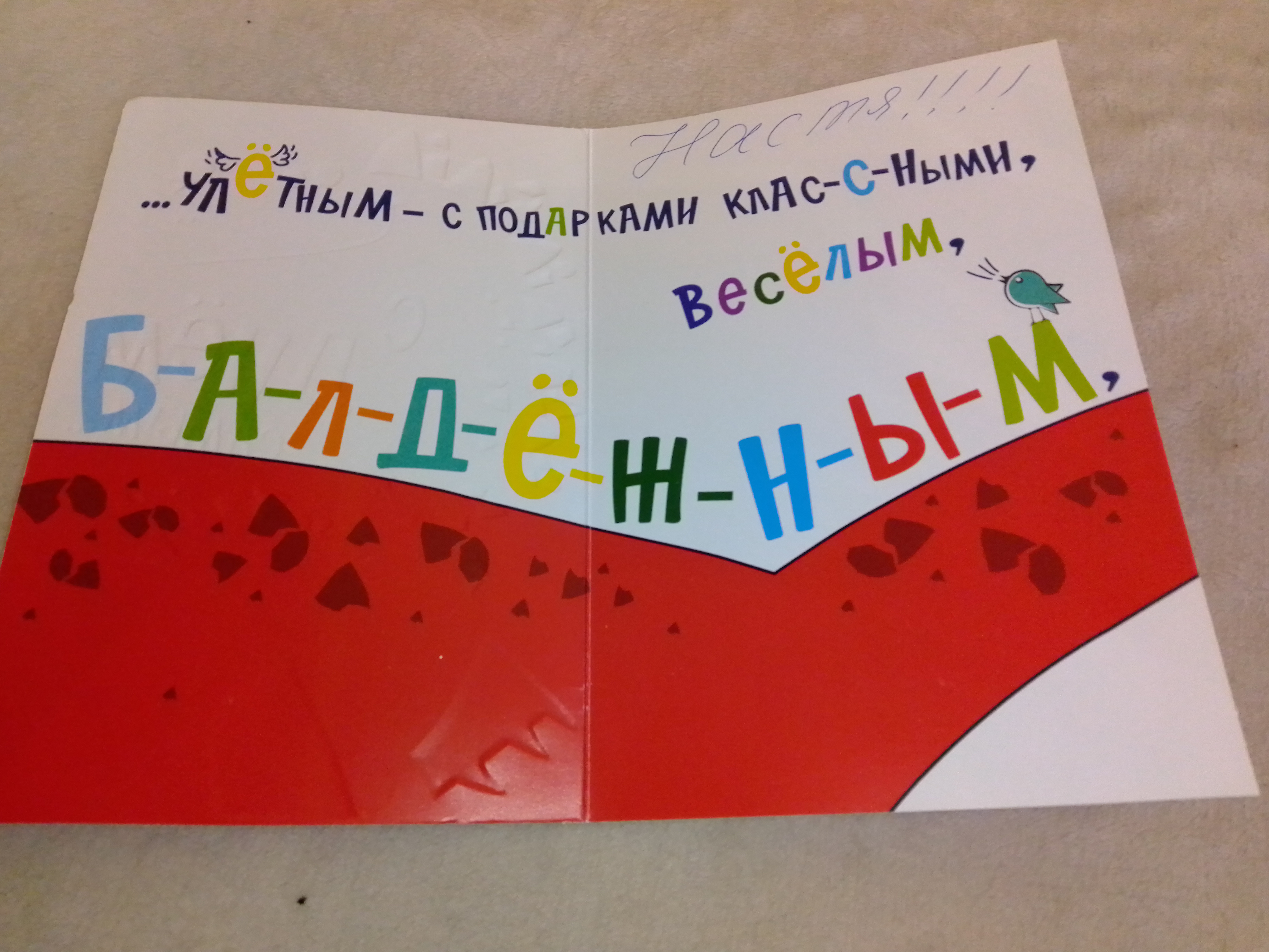 Настя просто в восторге. Показывала в школе, хвасталась. А Наталия (Tasha) прислала поздравление по почте. Замечательная открытка, шоколад и набор для самодельной открытки. Шоколад тут же был съеден, открытка сделана. Красивая получилась, пошлём кому-нибудь. Спасибо всем огромное! Вы доставили ребёнку большую радость. А самое главное, показали, что она не одна; что вокруг много хороших людей.