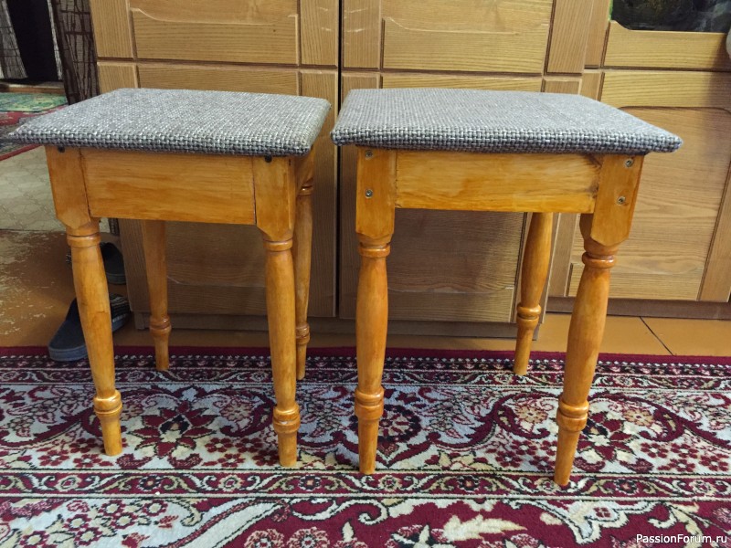 Я уже показывала один из этих стульев. Но приняв к сведению справедливое замечание по поводу сидушки, взяла эту часть работы на себя. Переделала заодно и прежний табурет.