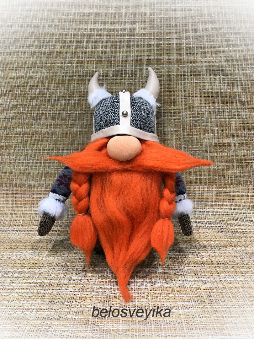 Эта техника изготовления кукол называется кукла из носка.В носок засыпается крупа, соль или любой наполнитель.Это тело куклы.( используеться нижняя часть носка до пятки) Из остатков носка( верхняя часть от пятки до резинки) шьються рукава.Отрезок проволоки обматать синтепоном и надеть рукава. На кончик проволоки сшить рукавицы и набить наполнителем их.Отдельно приклеивается борода, усы, нос. .Шьёте шапочку из 4-х клиньев, украшаете её рогами, мехом, кожаными полосками с разными железками.И викинг готов. Если в носок засыпана крупа, то он очень устойчиво стоит