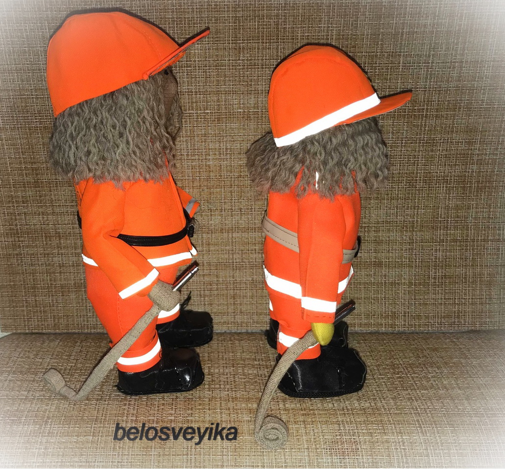 На подарки мужчинам заказали пожарных.Бороды и усы им делать нельзя. Сделала волосы из распущеной пряжи. Отделка костюмов светоотражающей лентой.Надписи и цифры по желанию заказчиков. В руках пожарный шланг.