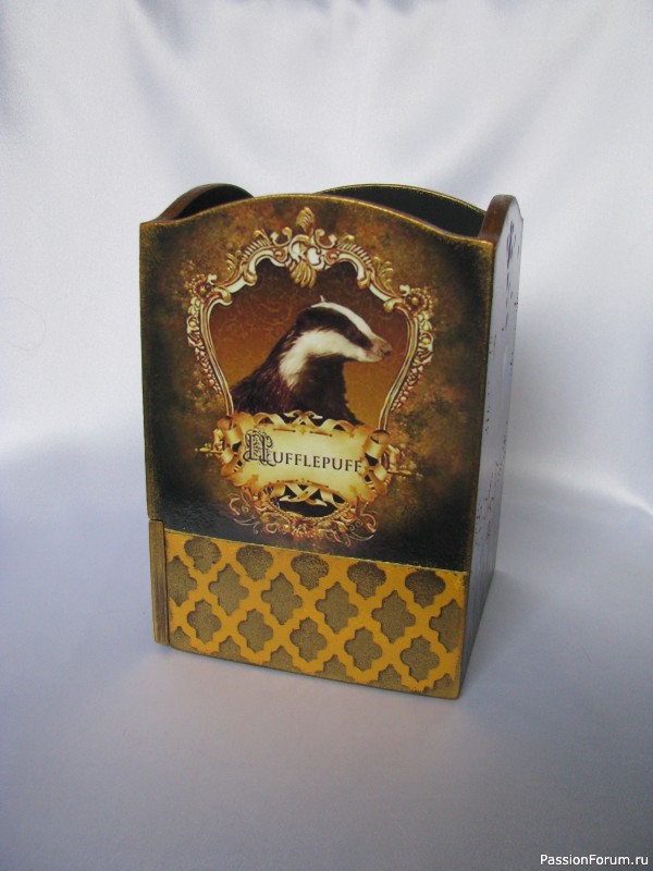 Галина, спасибо! Фон на подставке для телефона делала сама. На карандашнице сначала трафаретный рисунок был из двух тонов акриловой краски. Мне не понравилось, и я решила золотом через трафарет тонировать. Смещение я не задумывала, так получилось на одной стороне и пришлось остальные сделать аналогично. Расписала там сям эмблемы факультетов золотым контуром.