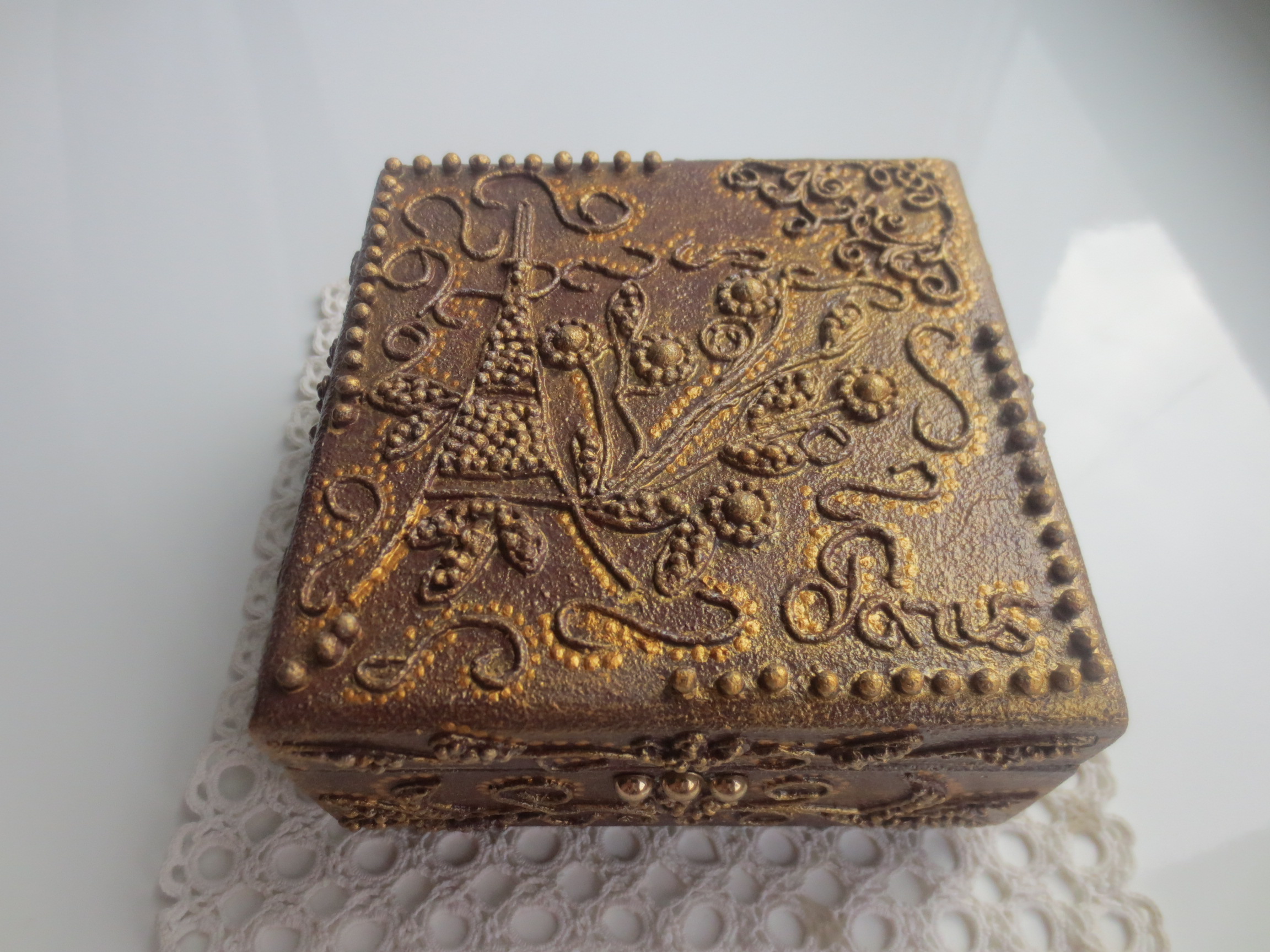 Симпатичная шкатулка.Все, что связано с Францией меня привлекает.Понравилась идея использовать для ножек пуговицы.