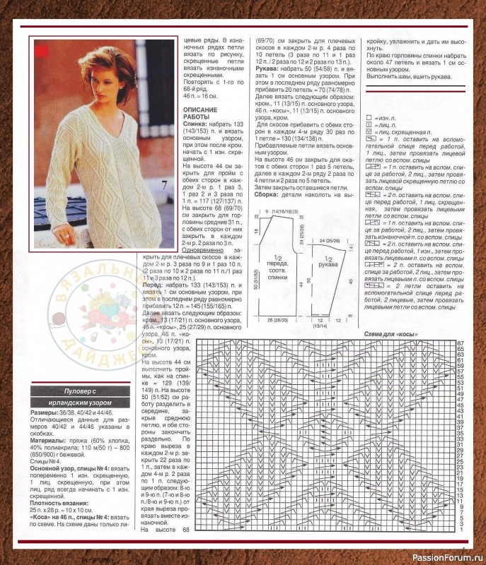 Наклонные ромбы обрамляют основной вертикальный узор из геометрических переплетений кос, образуя две широкие полосы на полочке и спинке, а также по одной полосе на каждом рукаве. Узор хорошо оттенён резинкой 1х1 из скрещенных лицевых и изнаночных петель. Этой же резинкой и заполнены сами наклонные ромбы. Очень удачная модель – свободный крой и вертикальные узоры придают фигуре стройность.