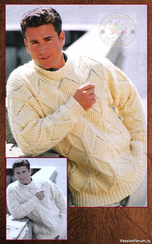 Мужской пуловер связан из чистой овечьей шерсти белого цвета прямого покроя с воротником стойкой. Очень похож на модели, рассмотренные ранее за одним исключением, наклонные ромбы заполнены узором рис.