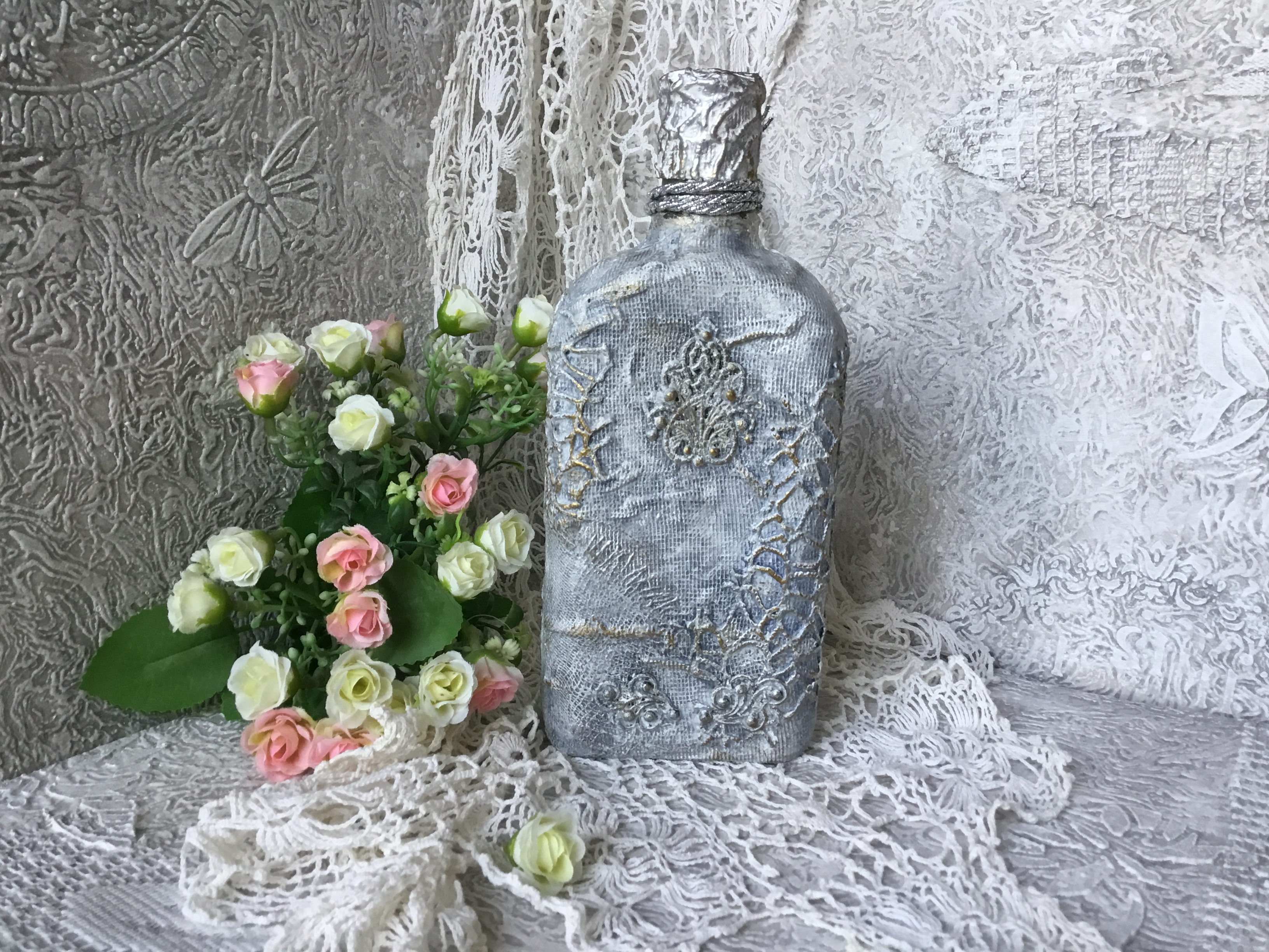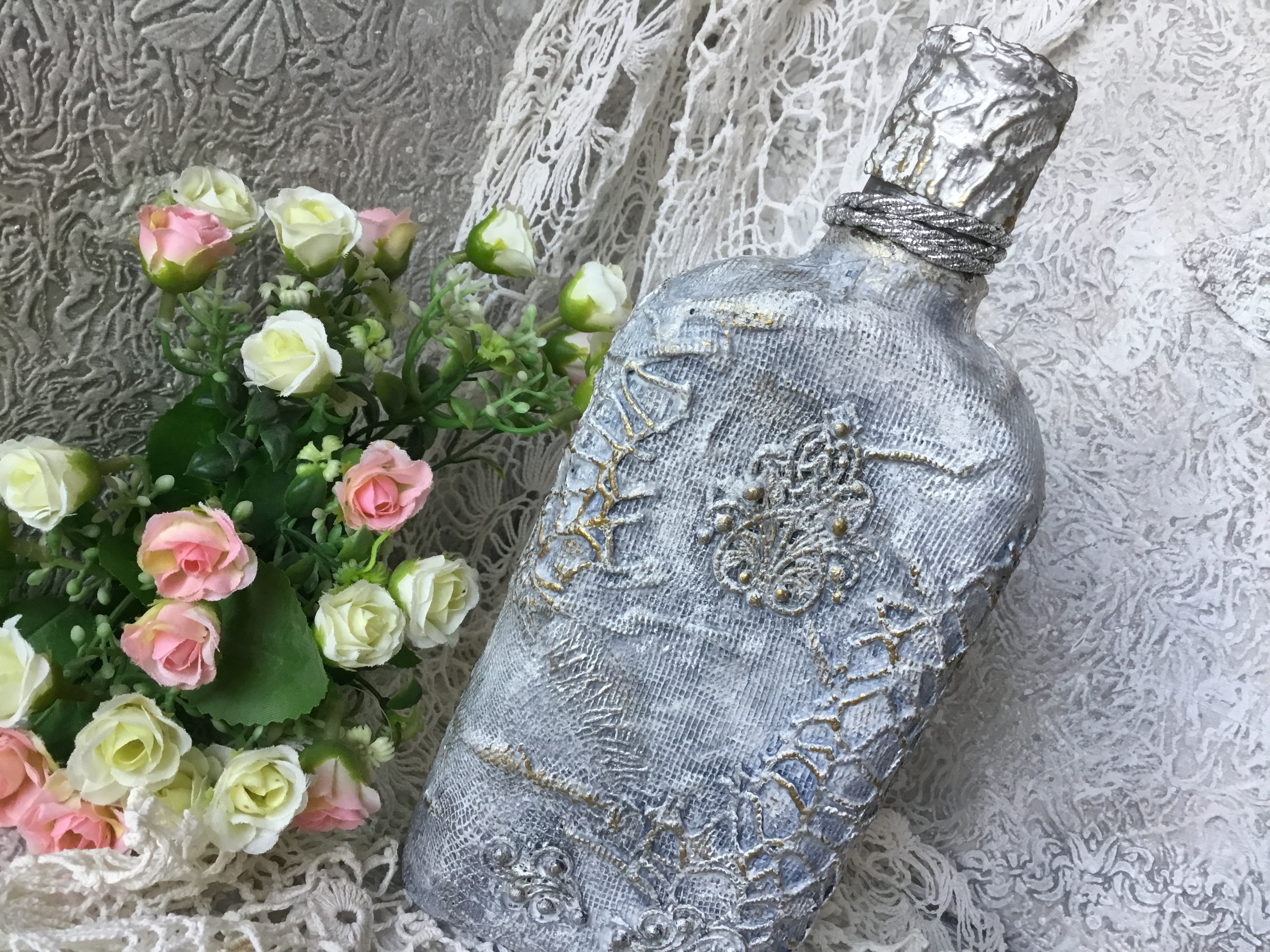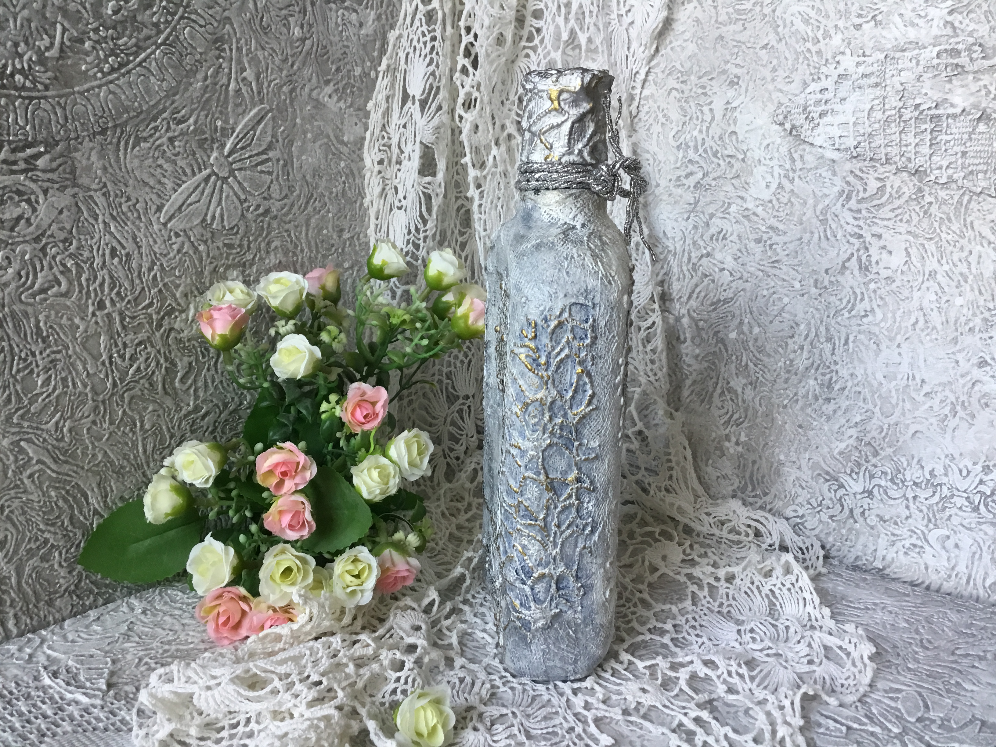 С большим вкусом и мастерством сделаны все бутылочки, но самые шикарные- это две последние работы- очень красивые и нежные!