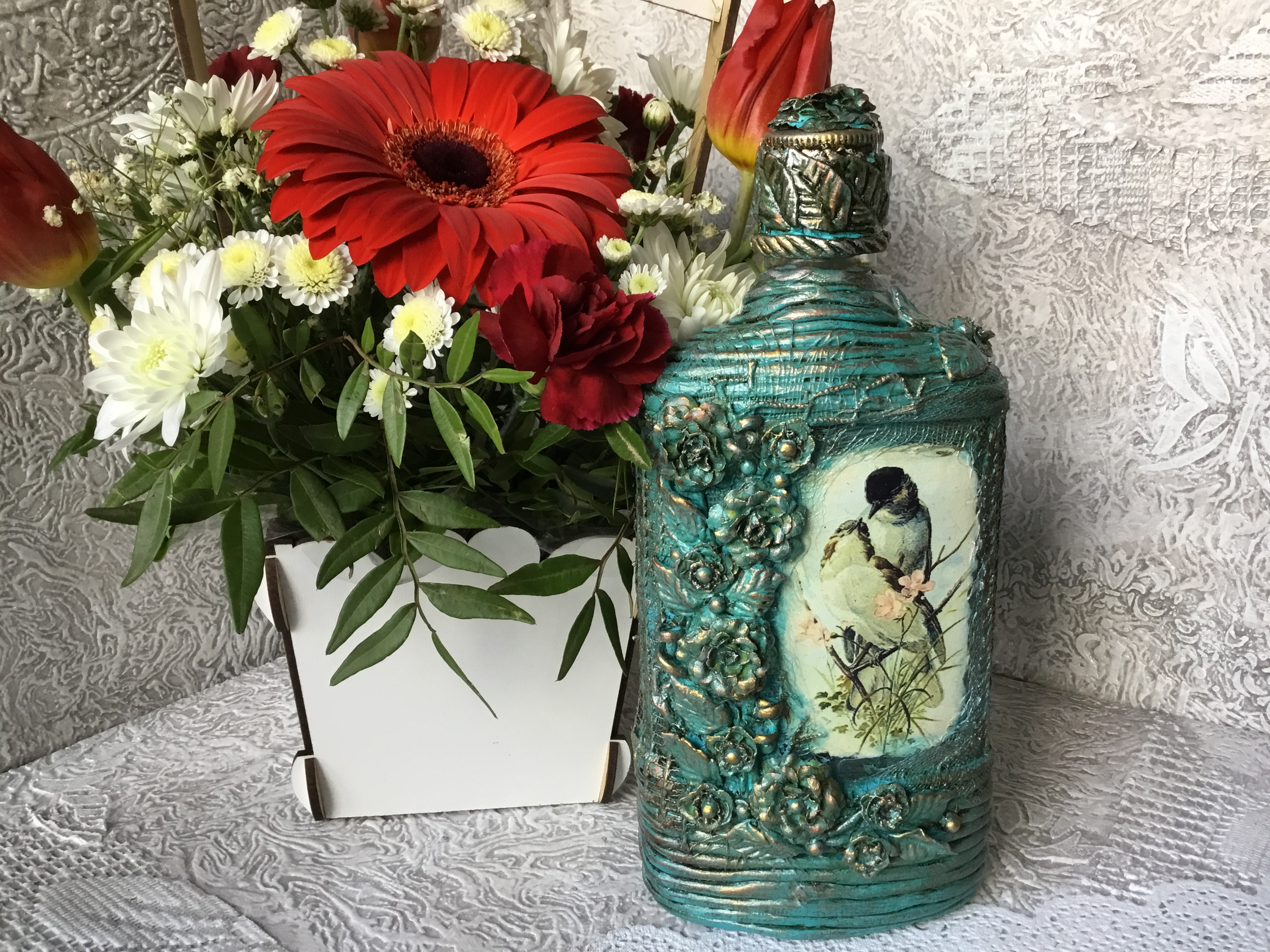 Очень понравились бутылочки, с марлей интересный эффект получился, и роспись контурами хороша!