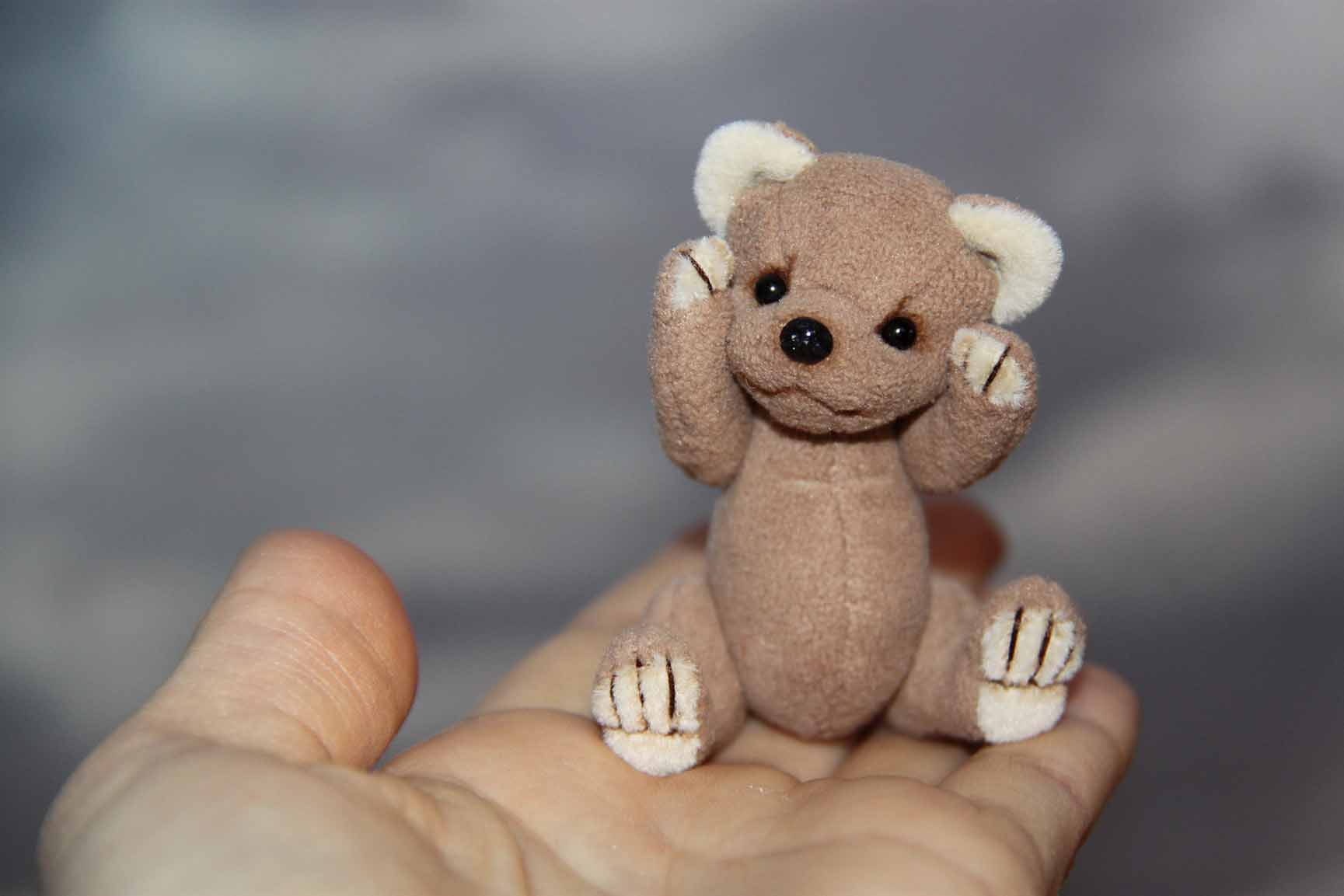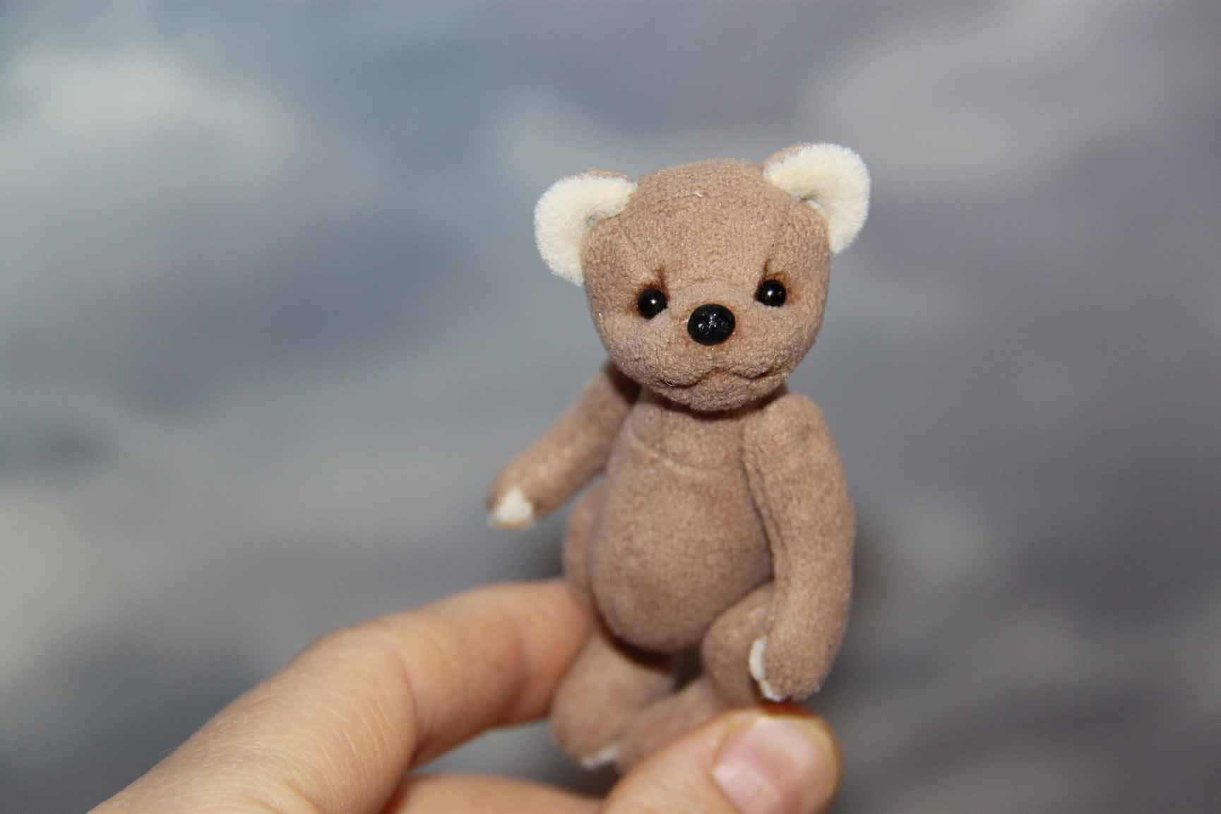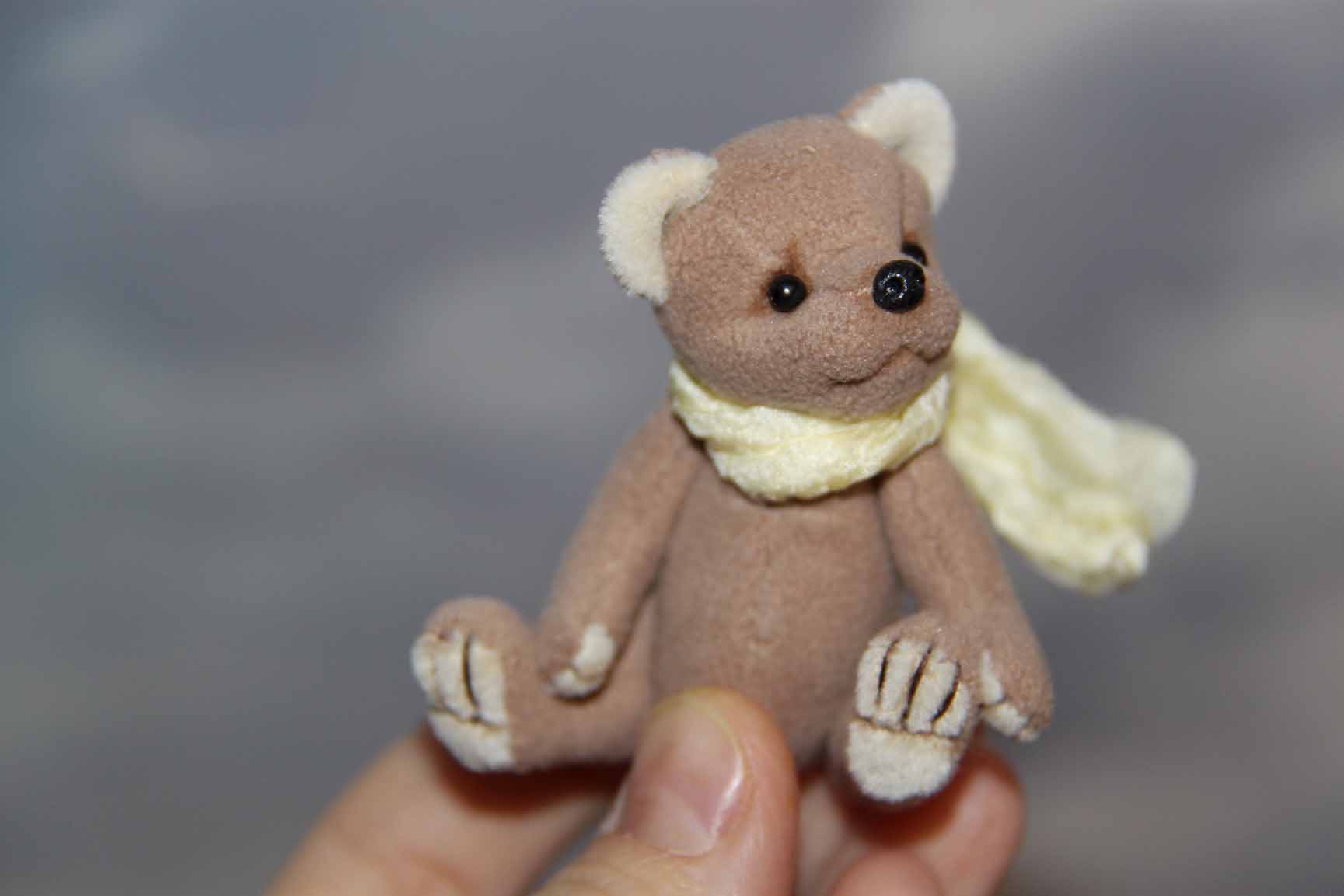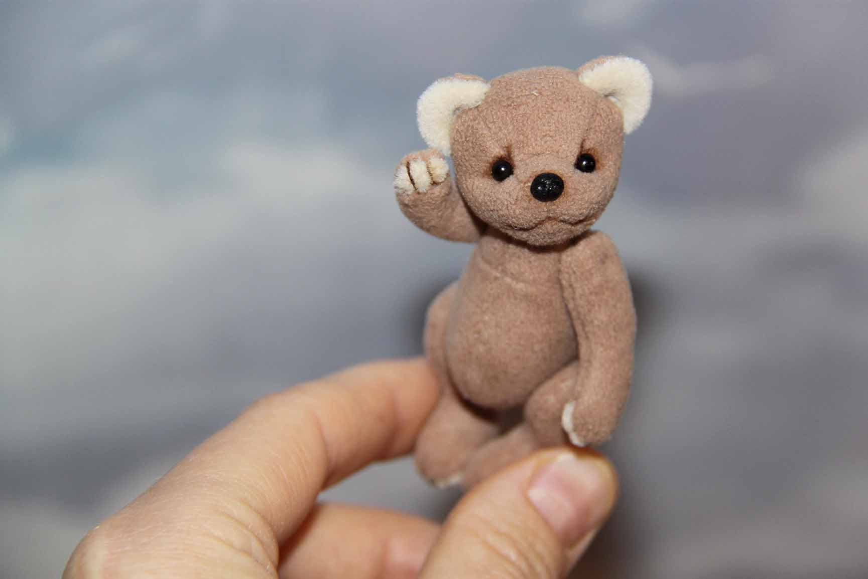 Малыш выполнен в технике тедди, голова и лапки подвижны. Рост 7 см. Самостоятельно сидит.