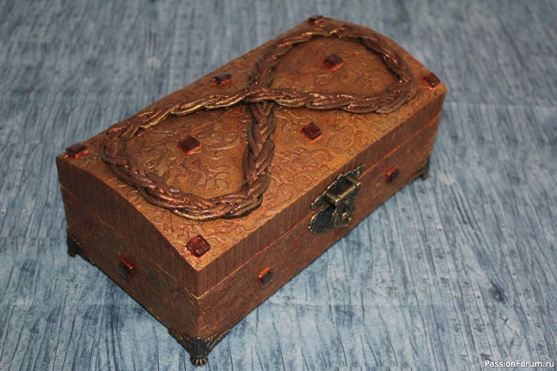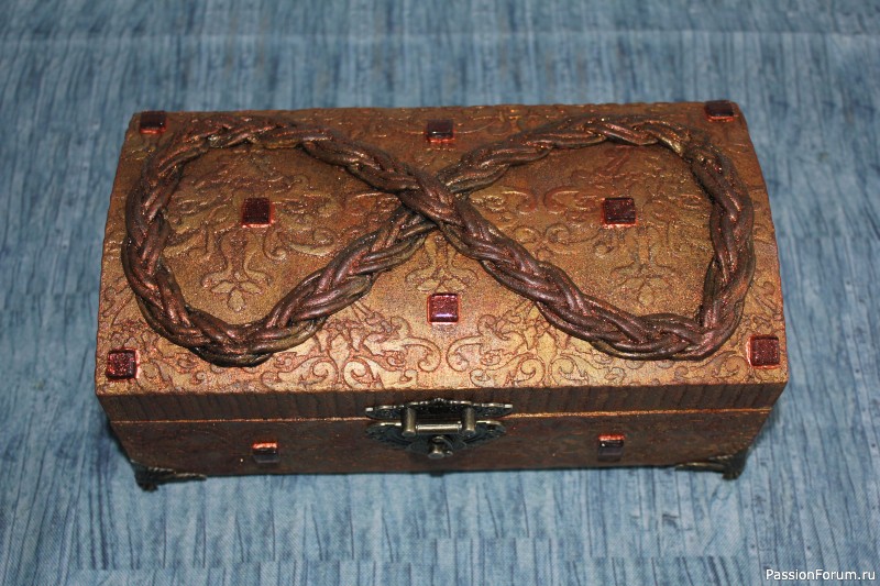 Шкатулку прошкурила, нанесла через трафарет рисунок шпаклевкой, покрасила в коричневый цвет, покрыла лаком и пока лак не высох посыпала блески медного цветра. Из полимерной глины с помощью молда сделала восьмерку для декора крышки — ее тоже украсила блесками, местами оттонировала золотой и медной краской, покрыла лаком спреем готовую работы. Внутри велюр на крышке и на дне шкатулки, украсила ножками, поменяла замок и петли.